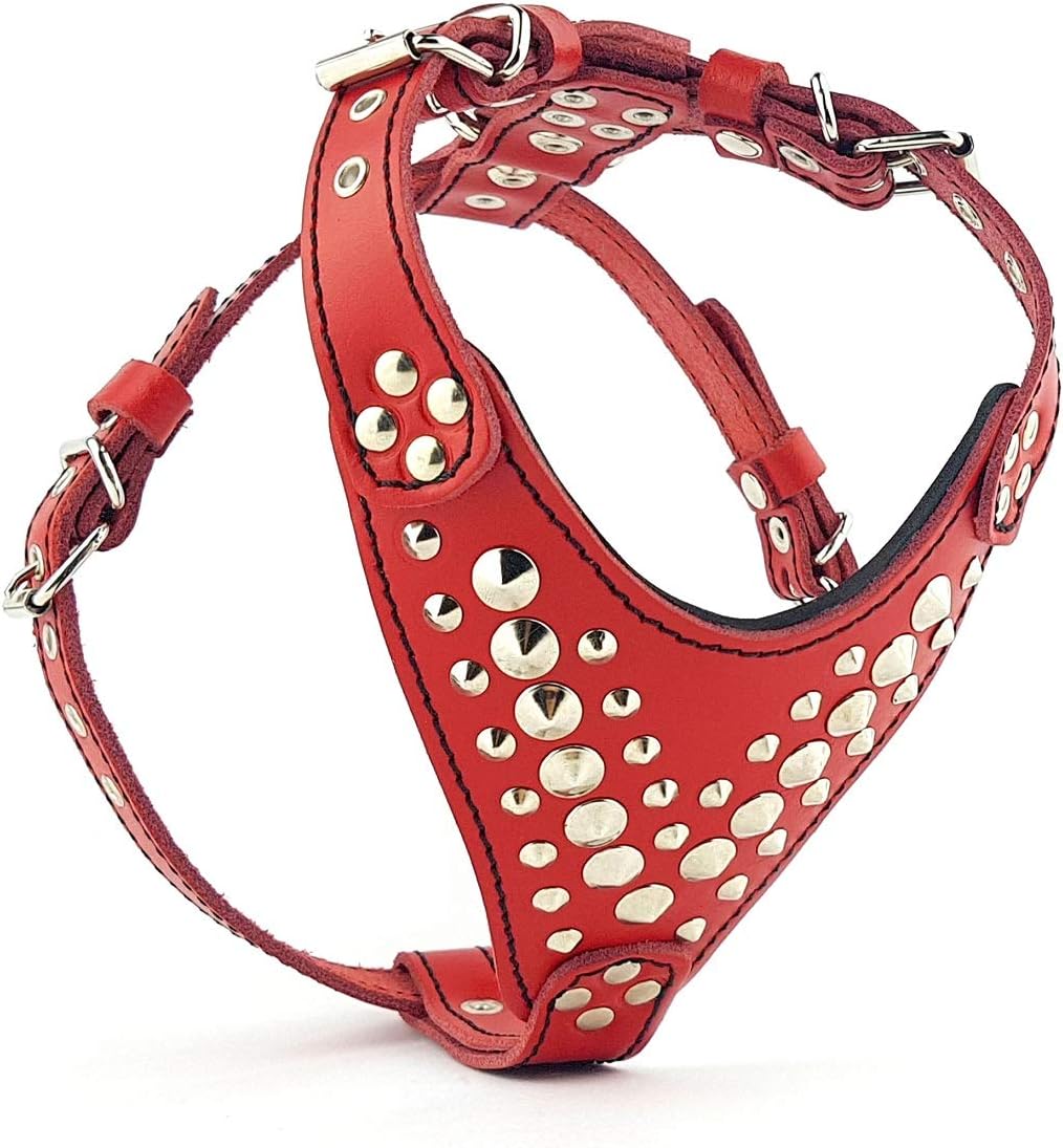 BESTIA CUSTOM DOG GEAR proudly presents: The "Star" harness is as unique as your dog. Featuring 2 sizes of studs. This harness is completely hand crafted by our small team. It has a soft foam cushion fitted on the chest plate to make it super comfortable for your pet. All metal parts and rivets are nickel plated in silver color. The buckles are 18 mm (0.7 inch) wide and the D-ring is 25 mm (1 inch) wide. Size chart: This harness fits on a lower chest circumference of 25 (9.8 inch) to 48 cm (18.9 inch) and a chest girth from 40 cm to 73 cm (28.7 inch) PLEASE MEASURE YOUR DOGS CHEST BEFORE PLACING YOUR ORDER The perfect gift for your small to medium sized dog, like: Pug, Bulldog, French Bulldog, Bull Terrier, Jack Russel, etc. 100% genuine leather soft padded handmade quality made in Europe unique design