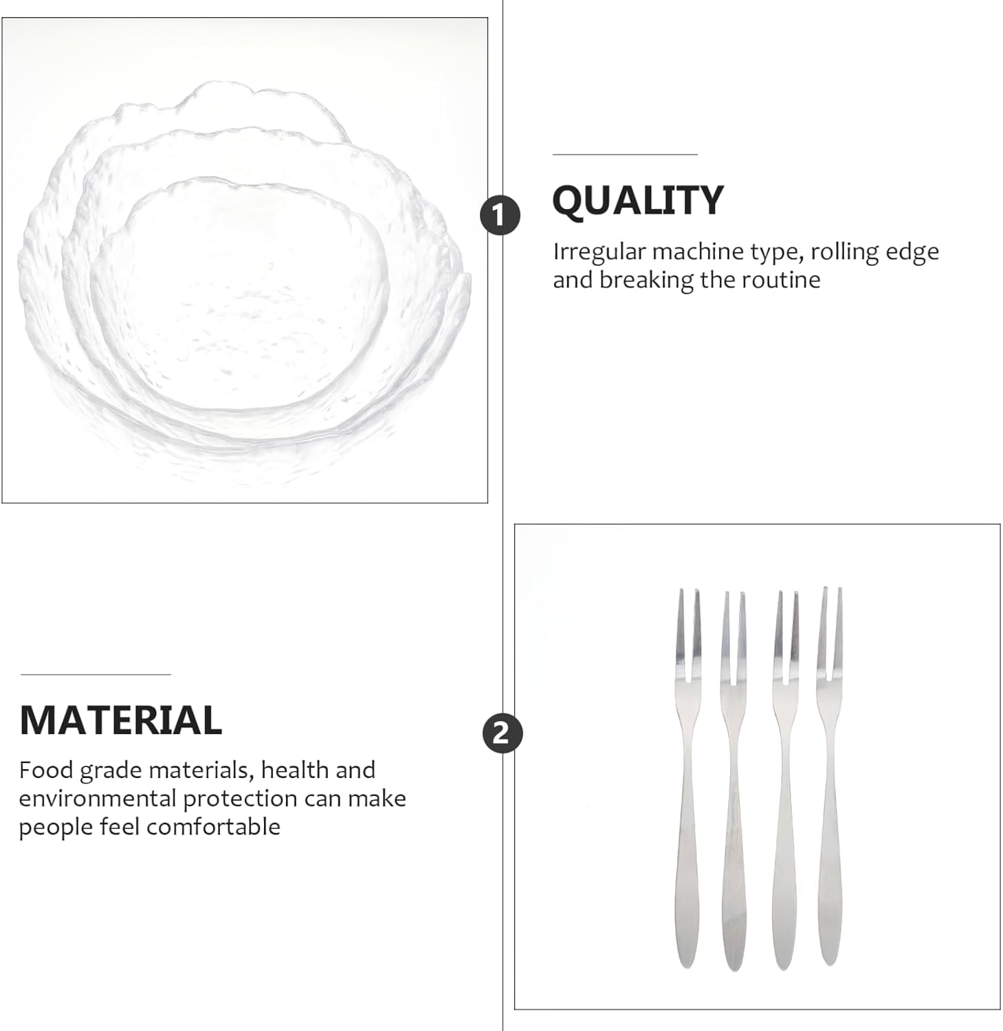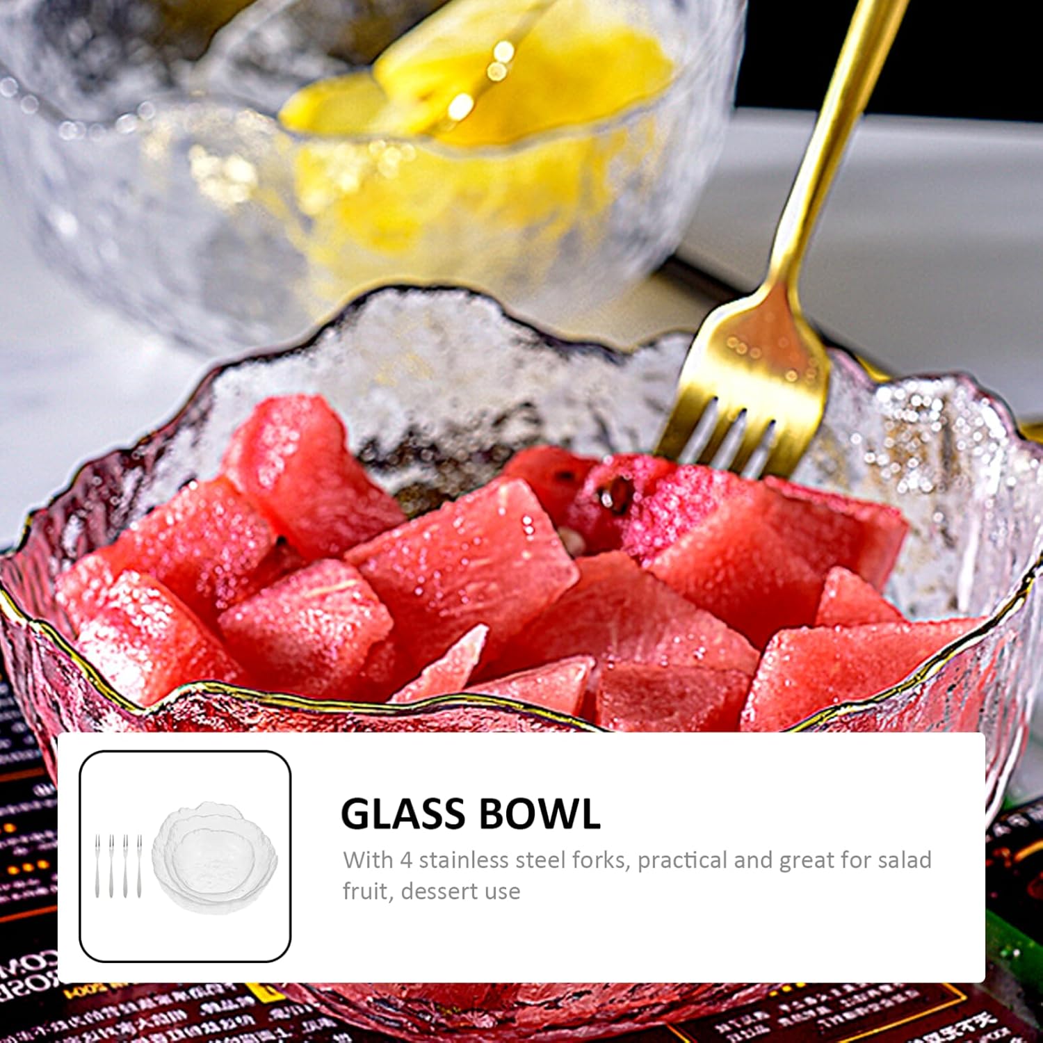 Package List 3 x salad bowls 4 x forks Features -Product Info:Hammer pattern salad bowl -Size: 20.00X20.00X9.00cm/7.86X7.86X3.54in. -Color: Transparent -Material: Glass, stainless steel - It is a tableware set with 3 different sizes bowls and 4 forks, practical to use. - The bowl features with design, creative texture, multi-function and quality clear salad bowl. - Perfect decorative food storage container for family gatherings, parties, celebrations, hotels and restaurants, etc stainless steel dessert bowl. - design and fine workmanship its popularity and utility fruit bowl for kitchen counter. - Suitable for fruit, dessert, cuisine food and others more serving bowl.Goods InformationSalad Dessert makes the dinner more interesting and unique.serving salad has a wide range of applications, and you can use it to store fruits, dessert, ice cream, etc.modern fruit bowl Not only can be a storage bowl , but also a beautiful tabletop decoration.fruit bowl for kitchen counter This salad bowl is selected glass material with detail, which is clear and chic