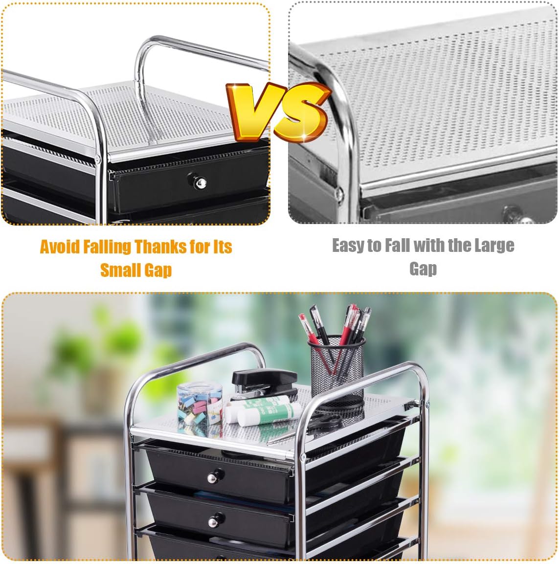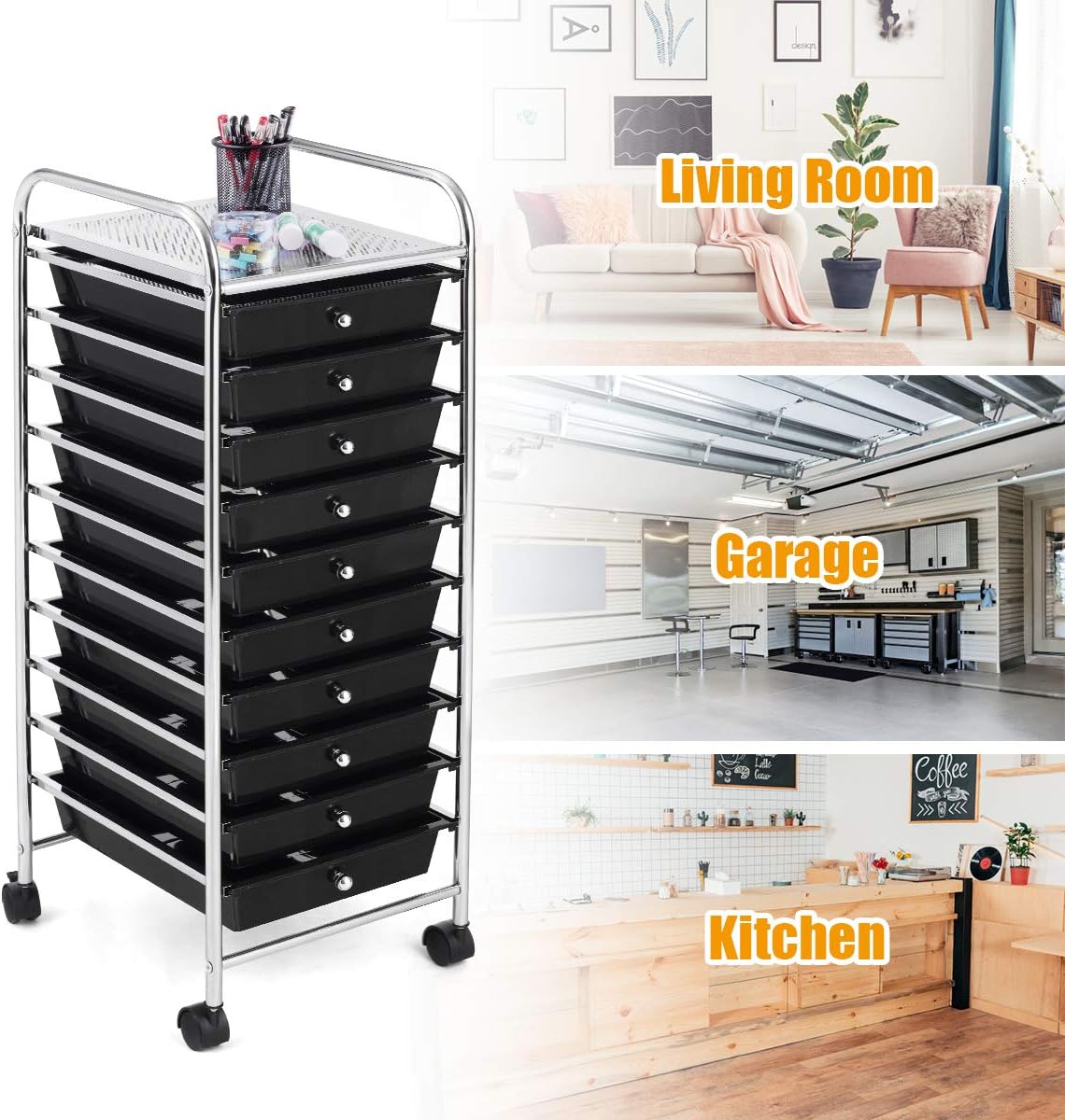 Description:This 10-drawer rolling storage cart features a vertical design that provides ample space for office supplies such as notepads, pens, staples and paper clips, while saving floor space. At the same time, each drawer is equipped with metal knobs for easy pulling. The cart is made of high-strength galvanized iron pipe, which is very durable for long-term use. There are 4 wheels underneath, which makes it easy for you to move it to any place. Better yet, there are multiple colors for you to choose, so you can put it in your office, home, garage or wherever you need to organize it according to your preference and the style of the room.Features:10 removable drawers for classified storageMetal frame and plastic drawers, sturdy and durable4 universal wheels (2 with lock) for easy movement and fixationDrawers slide through metal channels with no resistanceDrawer with metal knob for easy closing and openingEasy to pull or push the cart with 2 handles on the topSpacious storage space on the top of the cartIdeal drawer storage cart for home, office, garage and schoolDrawers are easy to clean with a damp clothEasy to assemble in short time according to instructionSpecifications:Color:Black/Clear/Multi-color/Rainbow/YellowMaterials: Steel, PPDimension of Each Drawer: 14” x 11” x 2.4” (L x W x H)Overall Dimensions: 15” x 13” x 34” (D x W x H)Maximum Weight of Top: 15lbsMaximum Weight of Drawer: 3lbsPackage Includes:1 x 10 Tier Storage Cart1 x Instruction