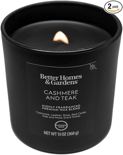 Better Homes & Gardens Set of Two-13oz Cashmere & Teak Scented Wooden Wick Jar Candles The Better Homes & Gardens 13oz Cashmere & Teak Scented Wooden Wick Jar Candles provides a warm glow and soft crackling sound when lit. This attractive matte black jar features a wooden lid with a leather pull. This highly fragranced candle in a paraffin wax blend is perfect for a variety of rooms in your home and will easily complement your existing decor. This enjoyable fragrance offers a citrus-infused blend with warm notes of brushed suede and wooly cashmere embellished with white rose accents, red cedar, rich moss, and sparkling musk. You are sure to enjoy this indulgent fragrance in your home. Burn time approximately 65 hours.