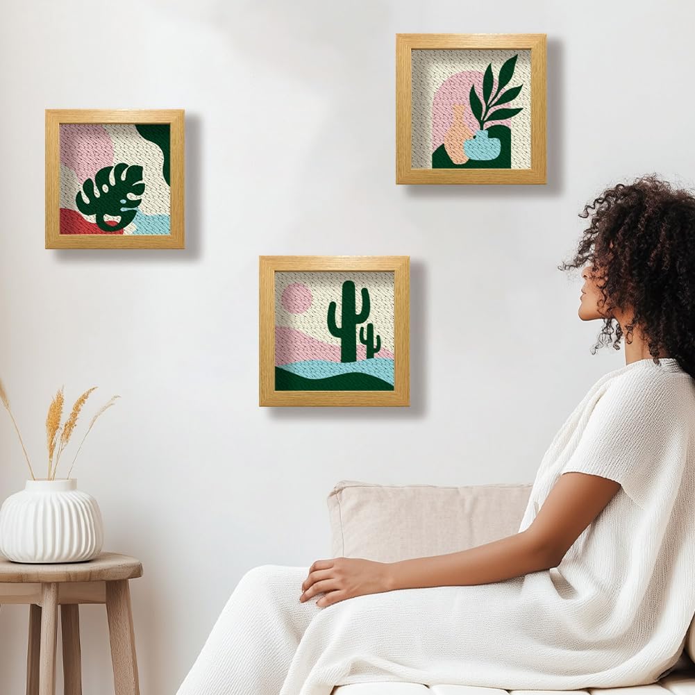 BEUNITONE 3 Sets Punch Needle Kits for Adults Beginner Plants Punch Stitching Kit Leaf Cacti Embroidery Starter Kits with Instruction Square Punch Needle Frame for Wall Home Decor 9.4'' x 9.4''