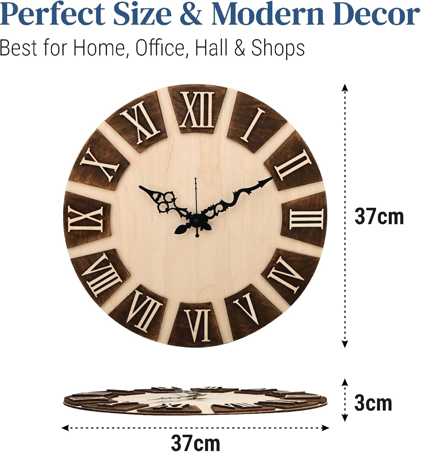 Product Description This Large 14‑inch Roman numeral wall clock combines a silent sweep quartz movement with a wood‑look dial and raised numerals for bold visibility and quiet accuracy. Battery powered and easy to mount, it suits living rooms, halls, bedrooms, kitchens and offices—delivering reliable timekeeping and a classic decorative statement for Indian homes. Manufacturer Contact Information Kuber Mart Industries Pvt.Ltd
