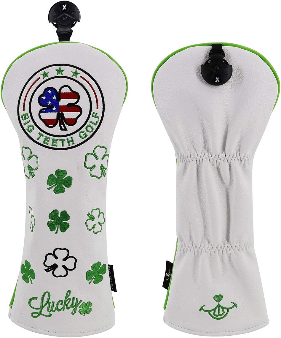 Big Teeth Golf Cover Lucky Clover Headcover Covers, Driver Fairway Wood Hybrid Headcovers Fits Blade Mallet Putter Iron and Woods with Magnetic White Shamrock Head Club Protector Leather
