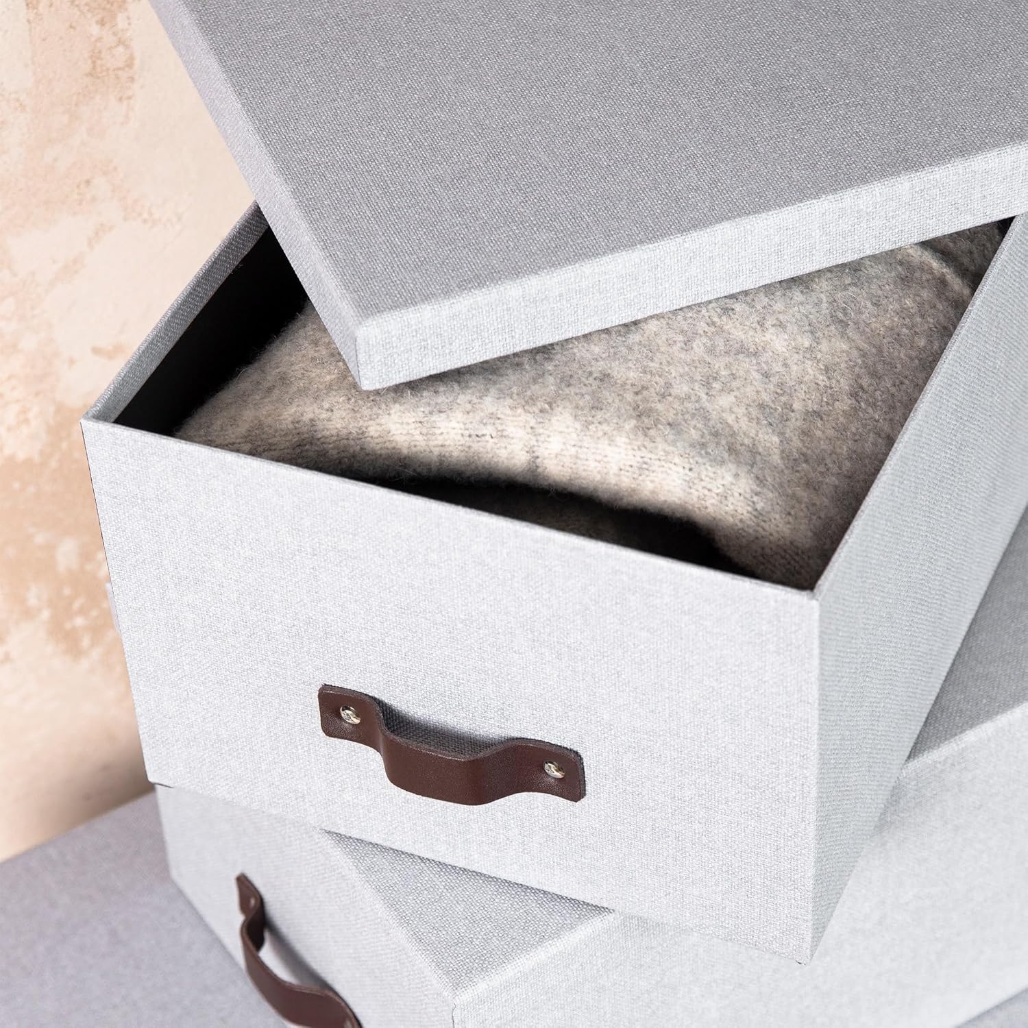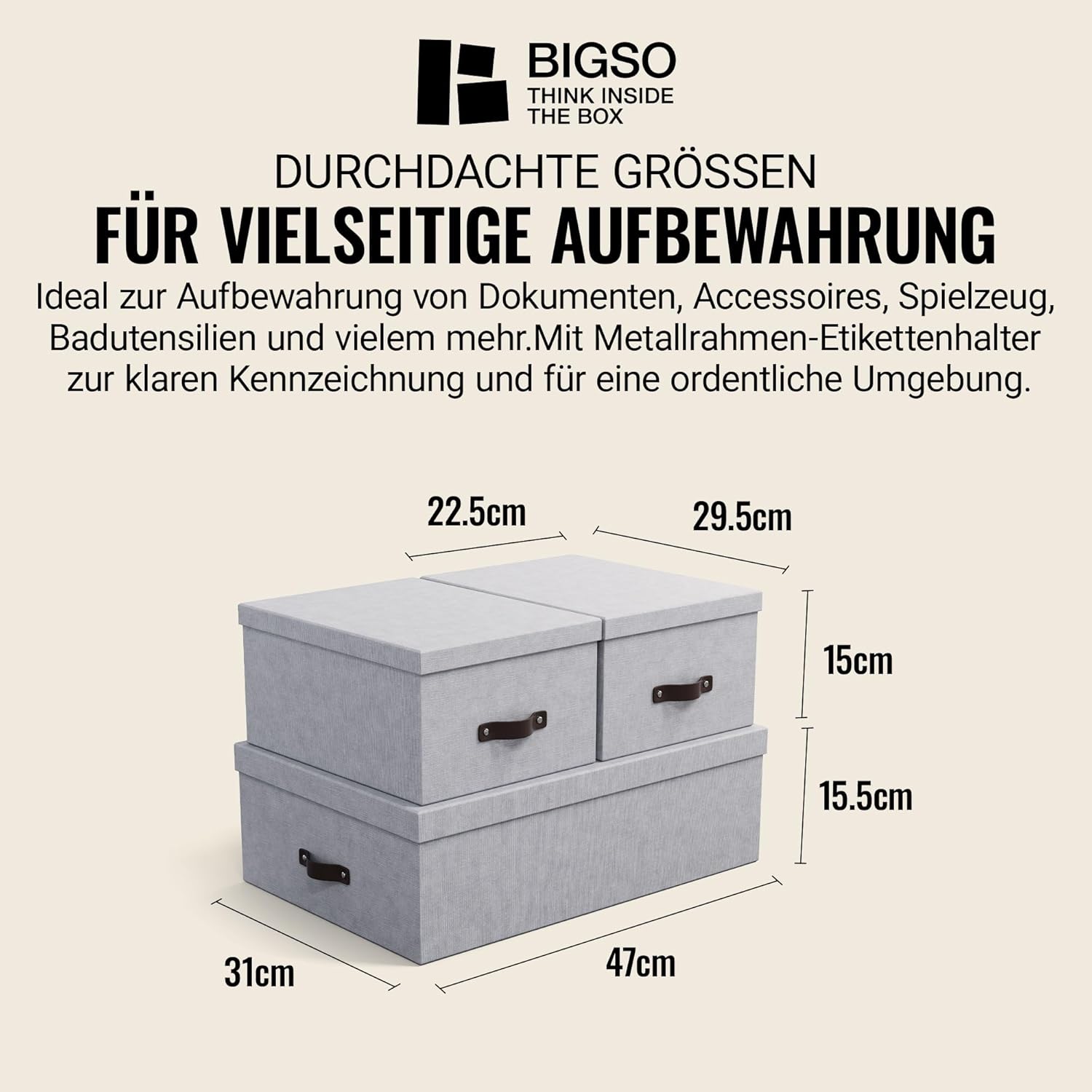 Neatly store seasonal clothing, bedding, and more - The Bigso Box of Sweden storage cubes in a set of 3 The set of 3 storage boxes in two sizes is suitable for stacking and storing bedding or seasonal clothing. The lids protect the contents from dust and dirt while the labels make it easy to see what's inside each box at a glance. With a high-quality body made from recycled fibreboard, the organiser cubes are extra stable to allow stacking for practical space-saving. Thanks to the muted colours and minimalist design, they blend into any space, no matter what the decor. Combining high functionality with an environmentally friendly design, it's the right choice for conscious office or home organisation. Product features in detail Set of 3 storage cubes for home and office Small and large sizes in each set Stackable for improved space efficiency Neutral and minimalist design Material: Fibreboard and paper Colour: Grey Dimensions: 2 x small boxes - 29.5 cm x 22.5 cm x 15 cm and 1 x large box - 47 cm x 31 cm x 15.5 cm Model number: 811345641