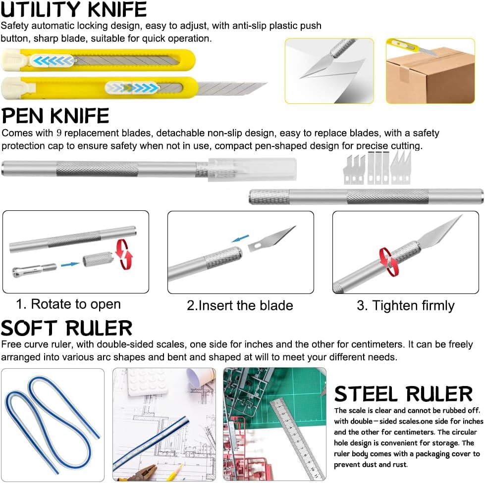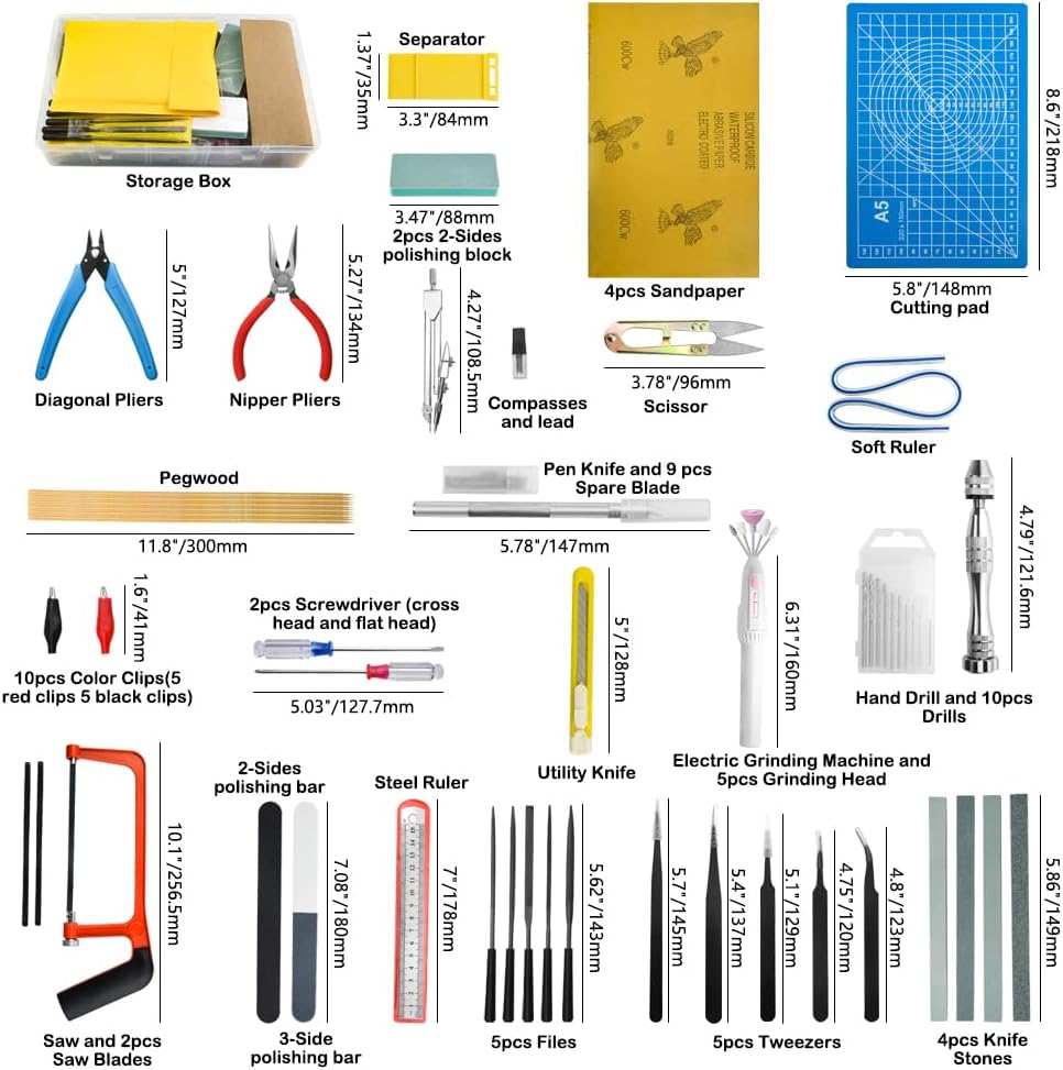 • ✈ FULL RANGE AND COST EFFICIENT: Package include : 4 X Sandpaper; 1 X Cutting pad; 1 X Saw and 2 Saw blades; 1 X Pen knife and 9 X blade; 1 X Electric grinding machine; 5 X Grinding head; 1 X Separator; 1 X Nipper pliers; 1 X Diagonal pliers 1 X Steel rule; 1 X Soft rule ; 10 X Color clip(10pcs pegwood and 5 red clip 5 black clip); 1 X Knife; 4 X Polishing block; 4 X Knife stones; 1 X Hand drill; 10 X Drills; 1 X Scissor; 1 X Compasses; 5 X Files; 5 X Tweezers; 2 X Screwdriver;1 X Plastic box