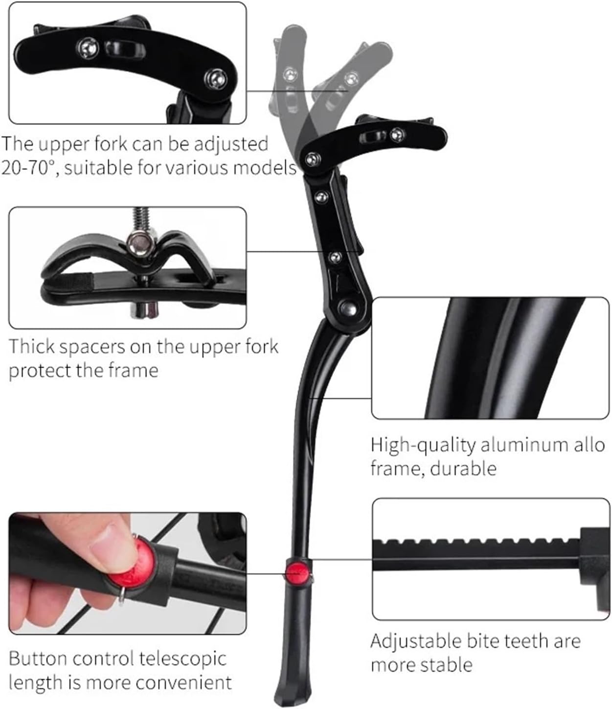 A Product DetailsMaterial: Aluminum alloySize: About 34-40cmWeight: About 315g: universal BikeB Product DetailsMaterial: Aluminum alloySize: About 46-50cmWeight: About 413g:24-29 Inch Bike==========Type : Bike KickstandModel Number : JC1005BK,2011-7AMaterial : Aluminum alloyB : 24-29 inche MRB bikeA : 24-27 inche normal bikeColor : Black Features : Adjustable,Note : A need use the Hexagon tool to adjustSize : About 34-40cm/46-50cmWeight : About 315,413g