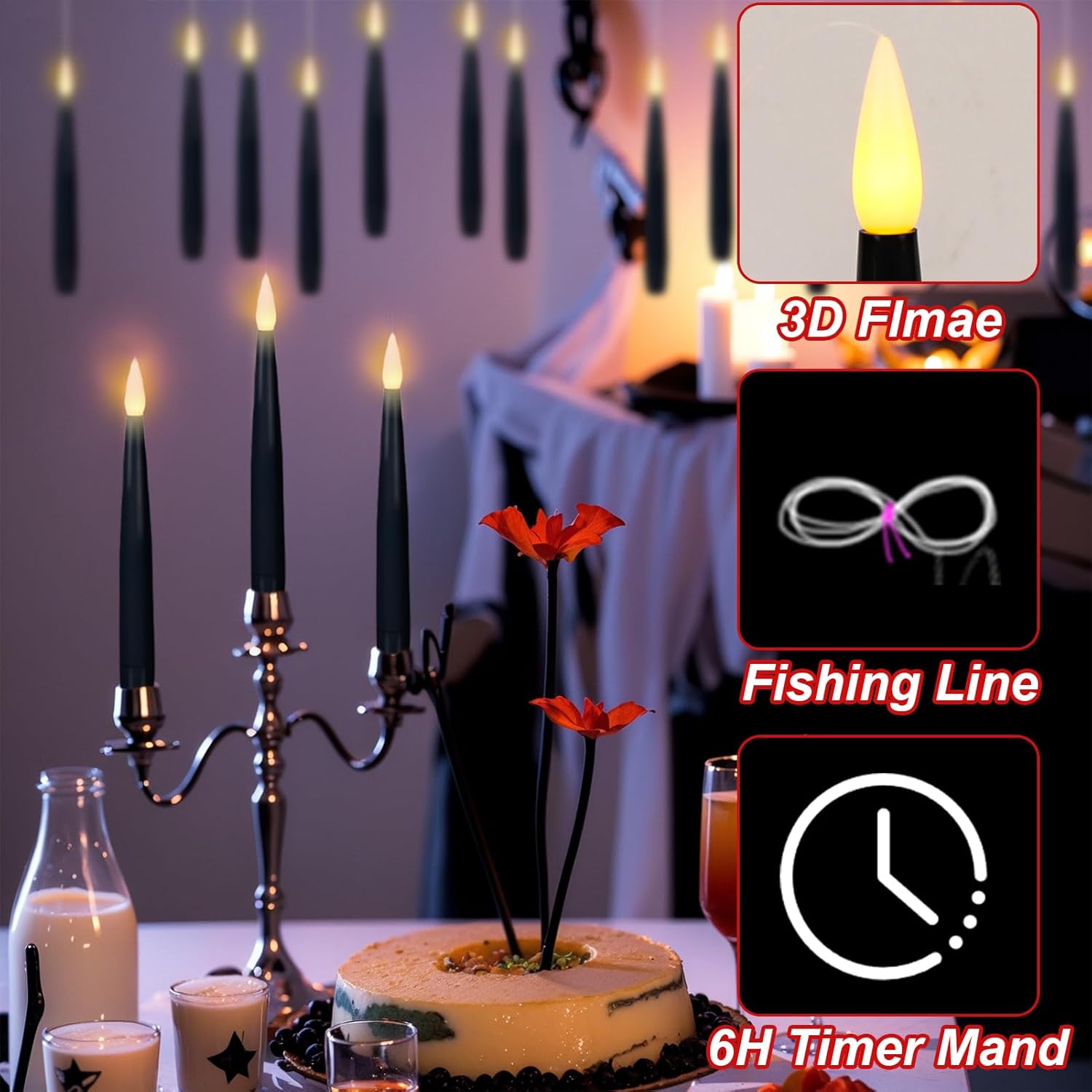 KunSwenn Black Floating Candles with Wand, Set of 22 Hanging Candles with Fishing Line, LED Flameless Halloween Taper Candle Battery Operated, Floating Candles Halloween Indoor Decorations for Spooky Scary Home Halloween Table Ghost Decorations
