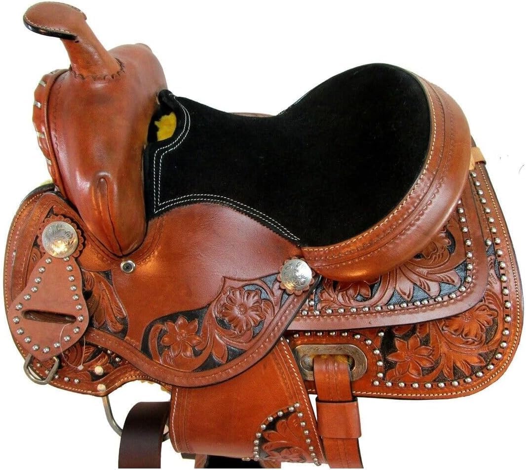 BLACK FLORAL TOOLED MINI CHILDREN KIDS LEATHER WESTERN PONY SADDLE HORSE 10" 12" 13" It is time to ride Beautiful floral tooled with waffle tooled all round Western Saddle. Saddle is sure to attract the attention on ring or court. Feature stitched leather padded seat with detailed floral design. Well padded comfortable brown suede seat hold you tight . Wood and fiberglass tree is light weight and well made to ensure the strength. Nylon reinforcement on Leather stirrup for Extra Safety.. Saddle Specifications: Tree: Semi Quarter Horse Bar Seat: Padded Black Suede Horn: 2.5" Swell: 10" Gullet: 6" Cantle: 3.5" Skirt: 24" x 22" Rigging: In Skirt C Stirrup Length: Shortest 22" & Maximum 28" Weight: 16 Lbs Color: Brown Stainless Steel Fitting Hardware Quick Adjust Blevin Buckles Hand Tooled Genuine Leather In addition, due to monitor and lighting differences, actual color may vary slightly from what appears online. Western youth saddle Saddles for Kids Kids Saddle Tooled Western Saddle Mahira Enterprises Western Saddles for Sale Western Leather Saddle Kids Western Saddle Floral tooled western saddle Kids Horse Saddle Western Horse Saddle