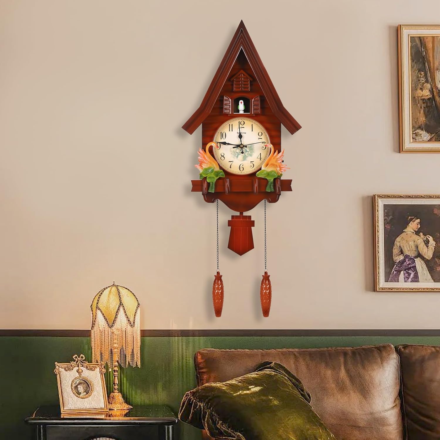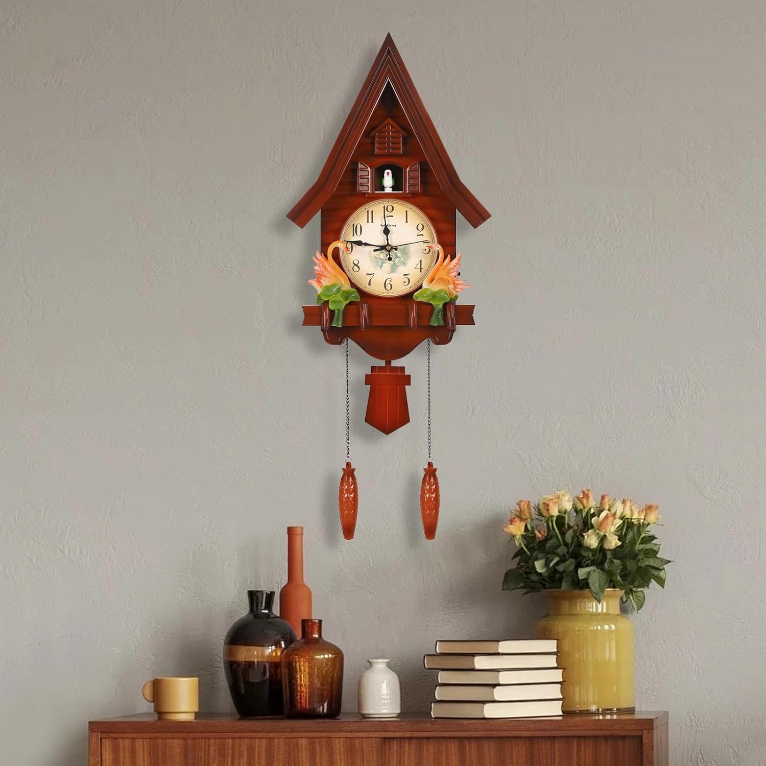 ApplicationIt is ideal for living rooms, bedrooms, hotels, offices, sitting rooms, kitchens, dining rooms, foyers, cafes, shops, workshops, conference rooms, clubs, and so on.It is not only a clock but also a great decoration.How to Install1.Determine where nails(not included) will be installed.2.Secure the nails with a hammer (not included).3.Align the nail with the wall clock.4.Complete the installation easily and conveniently.SpecificationsStyle: ModernShape: HouseMaterial: PlasticIndoor/Outdoor Use: IndoorMounting Type: Wall MountDisplay Type: Pointers+ Numbers+Time ScalesPower Source: Battery PoweredOperation Mode: MechanicalAdjustable Volume: Yes (High, Low or Off)Movement: Silent MovementBattery Type: 2* C Batteries+2*AA Batteries (Not Included)Chime Time: 6:00-21:00Noise: 20dBProduct Size: 32.5*11*69cm/12.8*4.33*27.2inPackage Size: 55*35*20cm/21.65*13.78*7.87inGross Weight: 3kg/6.61lbsNet Weight: 2.8kg/6.17lbsPackage Included1* Wall ClockNotes1. Please avoid using it on rotting wood and peeling walls.If you use it on tiles, please nail it at the joints to avoid damaging the surface of the tiles.2. Batteries are not included and you should prepare yourself.3. Please use a soft cloth or brush to clean the product, do not use chemicals to clean.4. Please avoid sun exposure and do not place the product in a humid place.5. Please allow the slight color difference caused by the shooting light and 1-3cm error due to manual measurement, and make sure you do not mind before you order.