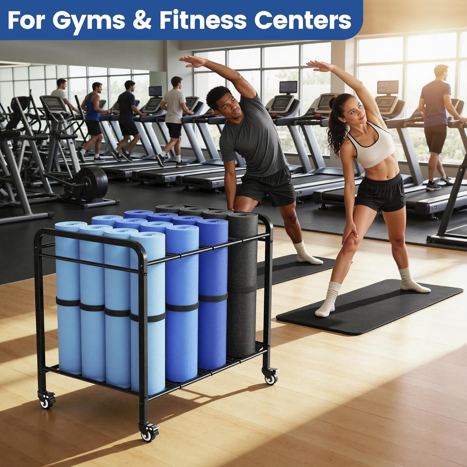 1.Designed for gyms, yoga studios, fitness classes, and high-capacity home gyms, this heavy-duty rolling yoga mat storage cart provides a clean, professional solution for organizing large numbers of yoga mats in busy workout environments. 2.With the ability to hold 16+ yoga mats, this storage cart is ideal for studios and gyms running group classes, training sessions, or daily fitness programs. Mats are stored upright and easy to access, helping instructors and members quickly grab what they need while keeping floors clear and organized. 3.Built from strong metal with a reinforced, floor-standing frame, this yoga mat rack delivers commercial-grade stability for daily use. Even when fully loaded, the structure remains steady and upright, making it suitable for high-traffic studio and gym settings as well as serious home gym setups. 4.Equipped with smooth-rolling wheels, the cart moves effortlessly between rooms, storage areas, or workout spaces. Locking wheels keep the rack securely in place during classes or workouts, ensuring safety and stability on busy gym floors or in home gym environments. 5.The freestanding, vertical design maximizes storage capacity while minimizing floor space. No wall mounting or drilling is required, allowing flexible placement in studios, fitness rooms, garages, or basements. A clean black metal finish gives the cart a professional appearance that blends seamlessly into both commercial and home gym spaces. 6.Whether you manage a yoga studio, operate a fitness facility, or maintain a high-capacity home gym, this yoga mat storage cart offers a durable, space-saving, and easy-to-use solution for keeping mats organized, accessible, and ready for every workout.