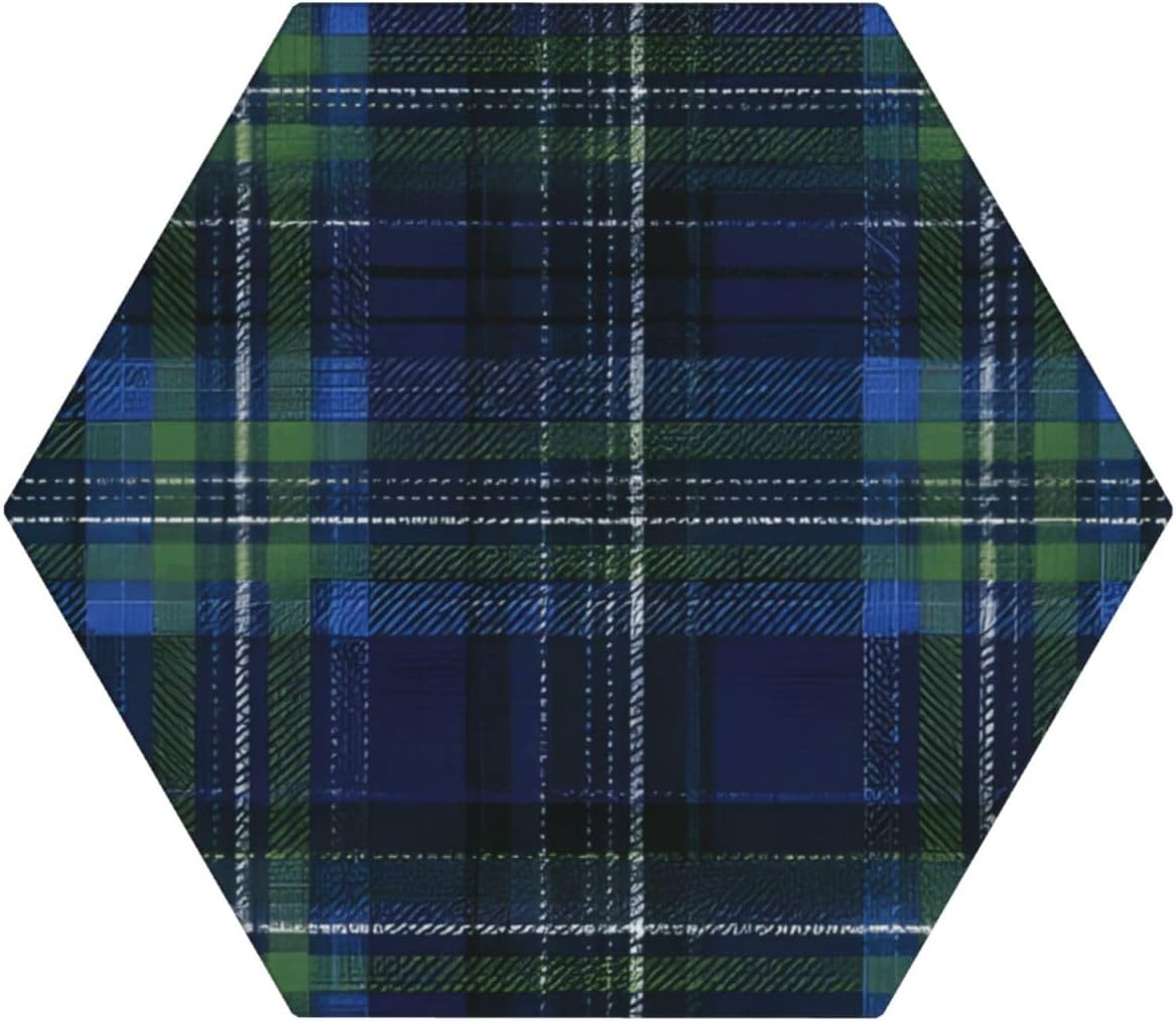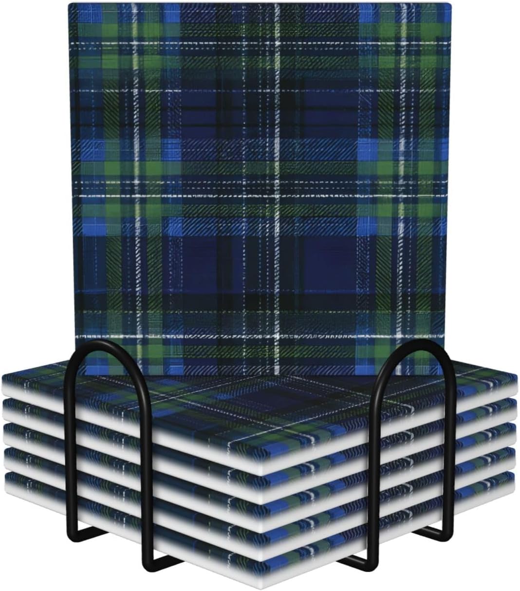 Product Name: DCEHGEW Ceramic Drink CoastersMaterial Type: Ceramic with cork bottomSize: Round: 4.1 x 4.1 inches, Square: 3.9 x 3.9 inches, Hexagon: 4.3 x 3.7 inchesPattern: Blue and Green Scottish Tartan About Our Ceramic Absorbent Coasters:Product Features - Crafted from high-quality ceramic, these coasters are odorless and eco-friendly. Their superior absorbency keeps your surfaces dry by quickly soaking up spills from coffee, cola, and other beverages within 10-15 seconds.Applicable Scenarios - Perfect for adding a stylish touch to your kitchen, living room, bar, hotel, or restaurant. These coasters are an ideal present for birthdays, Mother's Day, Father's Day, Valentine's Day, anniversaries, housewarming celebrations, or Christmas.Accessory Structure - Each set includes 6 ceramic coasters with cork bottoms, accompanied by a sleek black metal stand for organized and aesthetic storage. Choose from three different shapes to suit your style and needs.Washing Instructions - Easily clean these coasters with water or a damp cloth.Special NoteDue to different measurement methods, a deviation of up to 0.3 cm in size is considered normal.Please Note:The product images are for reference only. Actual products may vary slightly due to production factors such as batch differences and machine settings. Minor variations in color, position, and size are normal and not considered defects. Thank you for your understanding!Customer Service:We want to make sure you have an amazing experience with us. Please contact us with any feedback you may have. We love to hear from you and usually respond within 12-24 hours.