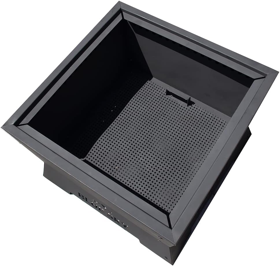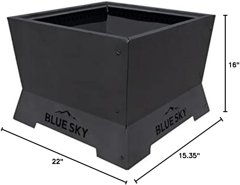 Amplify your next outdoor adventure while keeping warm and cozy with the Blue Sky Outdoor Living Square Peak Smokeless Patio Fire Pit. This smokeless fire pit offers a convenient way to enjoy a fire with friends and family on your patio. With a newly improved patent pending design, this fire pit delivers an incredibly efficient burn that can exceed 1,400 degrees Fahrenheit (760 degrees Celsius) without the worry of excessive smoke, sparks, ash, or embers. It can burn standard firewood, wood pellets, or a combination of both to generate significant heat, and the maximized square shape fits standard length firewood to extend your time by the fire. Assembly can be completed in 10 minutes or less thanks to the tongue and grove design that make it easy to secure the sides together, and the removable ash catch simplifies the clean up process. Constructed from heavy-duty steel with a double-wall design and top bezel, this patio fire pit improves airflow through the fire and draws oxygen into the fire while withstanding tough outdoor use. This fire pit measures 22" x 16" for the perfect fit on your patio.