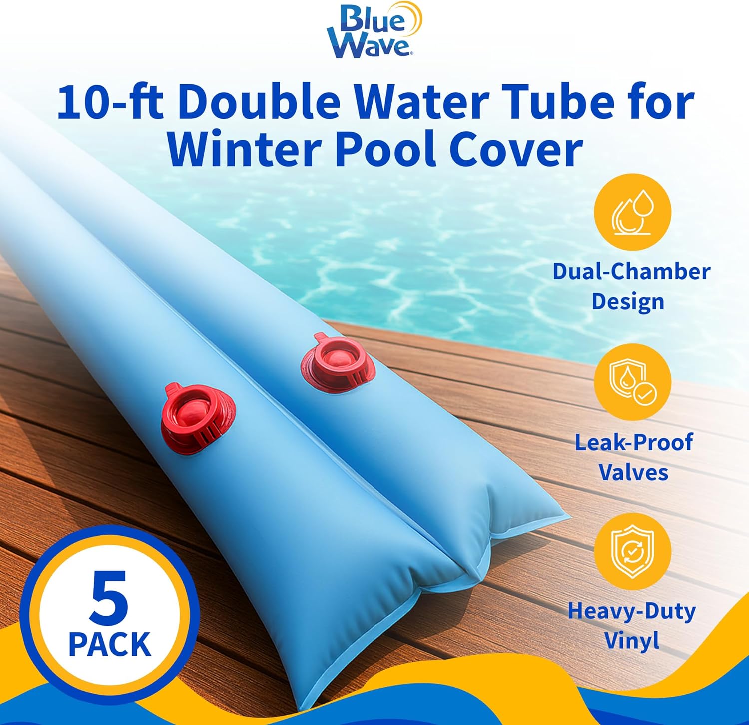 The Blue Wave 10-Ft Double Water Tube for Winter Pool Cover is a durable and essential solution for securing in-ground pool covers throughout the winter season. Designed to prevent wind lift and debris accumulation, this pool water tubes for cover option helps maintain the integrity of a pool cover, keeping it firmly in place. Constructed from heavy-duty water bags for pool cover material, the 18-gauge puncture-resistant vinyl ensures superior durability compared to standard pool cover bags. The dual-chamber construction evenly distributes weight, so even if one chamber is punctured, the other remains intact to hold the cover securely. This pool water bag heavy duty option is built to withstand freezing temperatures as low as -10°F (-25°C) and extreme heat up to 180°F (80°C), making it a durable choice for all climates. Featuring reinforced, leak-proof valves, these pool water bags heavy duty tubes allow for quick and effortless filling with a standard garden hose. Unlike traditional pool cover water bags, which may leak or shift, this water bag with tube is designed for a secure seal, keeping water contained without unwanted leaks. Built specifically for pool water tubes for closing winter, this product provides an efficient way to anchor pool covers, preventing movement caused by strong winds, heavy rain, or accumulated debris. The blue PVC construction is made to withstand extreme weather conditions, ensuring long-lasting performance throughout the winter months. The pool cover water blocks provide the necessary weight to hold covers in place without causing damage. Backed by a 90-day limited warranty, these pool tubes for cover provide a dependable method for maintaining a secure and well-protected pool throughout the off-season.