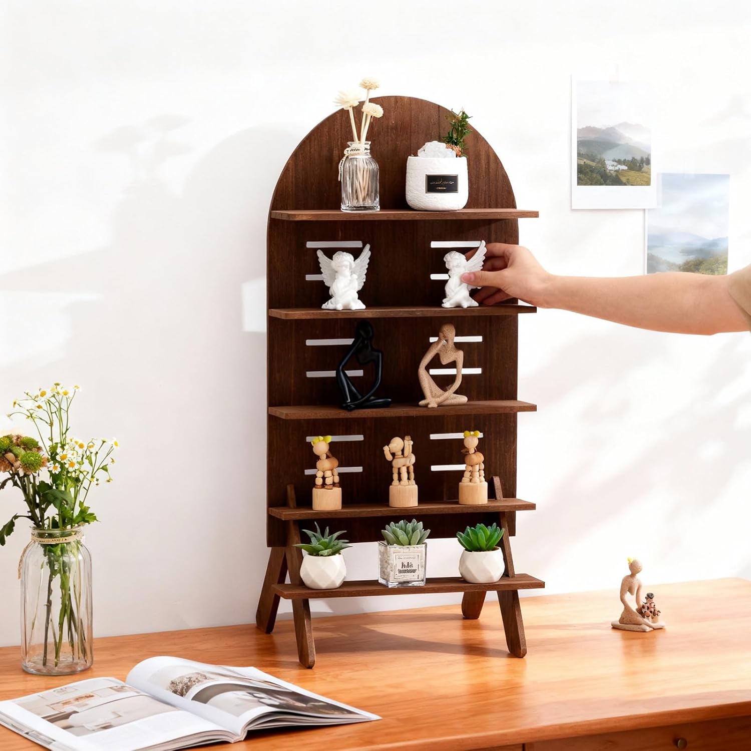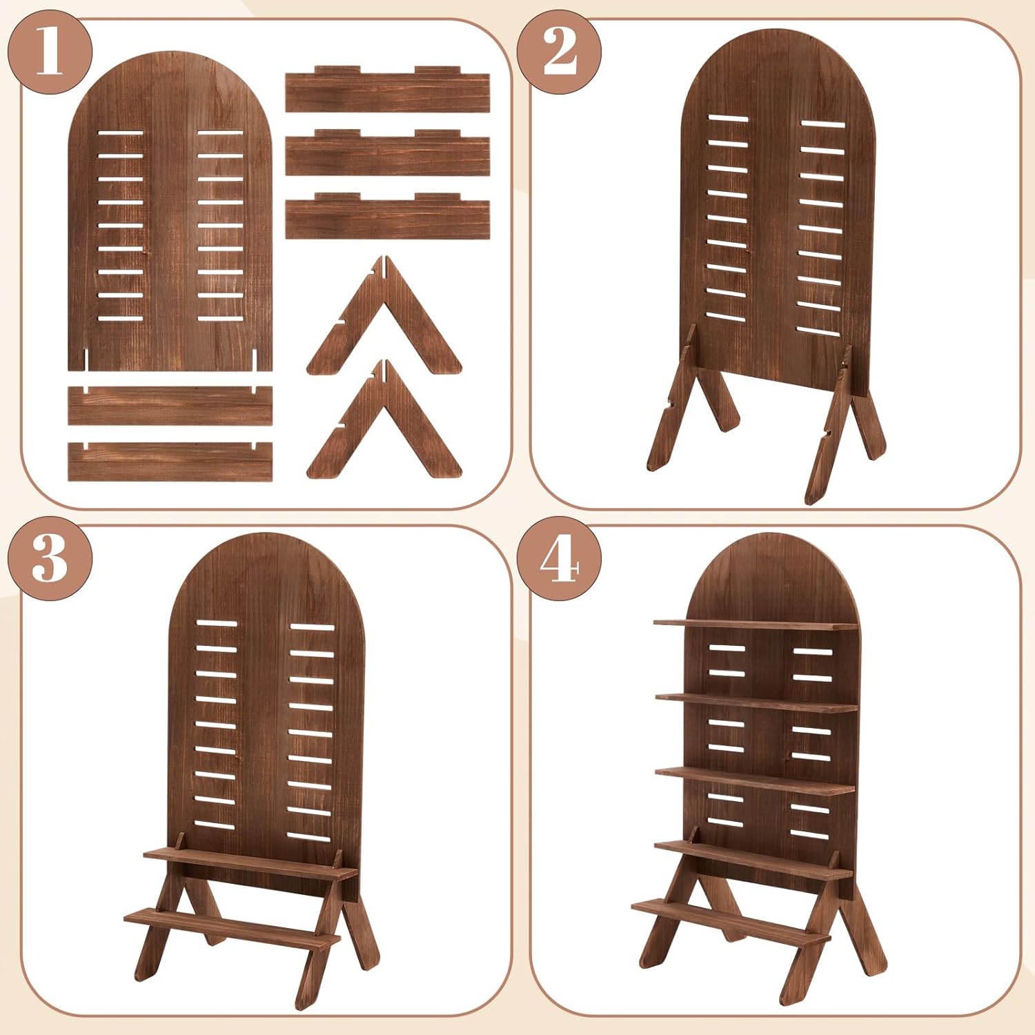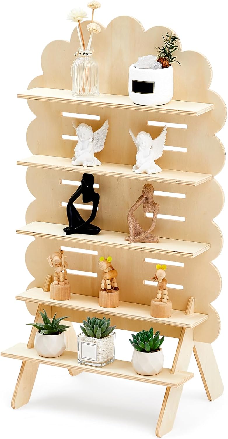 Features: The solid wood ensures reliable support for displayed items while maintaining a lightweight frame. Its balanced structure keeps products secure without compromising ease of movement. When disassembled, the stand stores flat, minimizing space requirements. This feature is particularly useful for vendors with limited storage or those who frequently travel between events. Specifications: Material: wood Color: wooden color Size: 31.5 x 15.75 inches/ 80 x 40 cm Package includes: 1 x Wooden display shelf stand Notes: Manual measurement, please allow slight errors on size. The color may exist a slight difference due to different screen displays. Small parts included, please keep them away from little kids to avoid swallowing risk. Small parts included, please keep them away from little kids to avoid swallowing risk