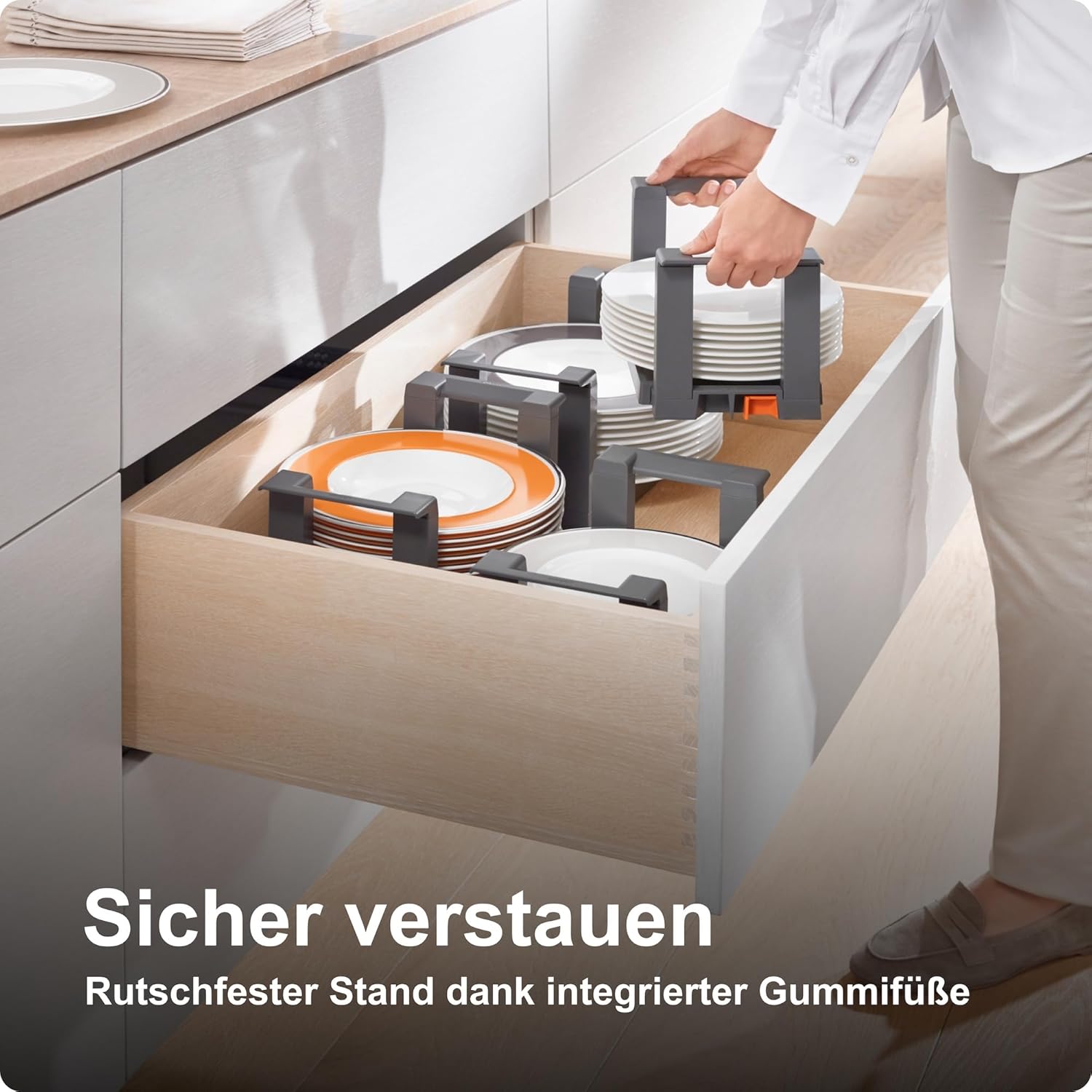 Features: Constructed from nylon and stainless steel providing the perfect location to store your plates Doubles as the perfect place to keep your stacked plates organized and a convenient carrier for moving to the table for dinner Able to hold up to 12 plates easily with a combined height up to 5-3/4" Adjusts to accommodate plates that have diameters from 7-5/16" to 12-11/16" Non-slip bottom prevents movement while stored in drawers or resting on counters and tables Specifications: Height: 6.6875" (170 mm) Number of Compartments: 1 Material: Nylon and Stainless Steel