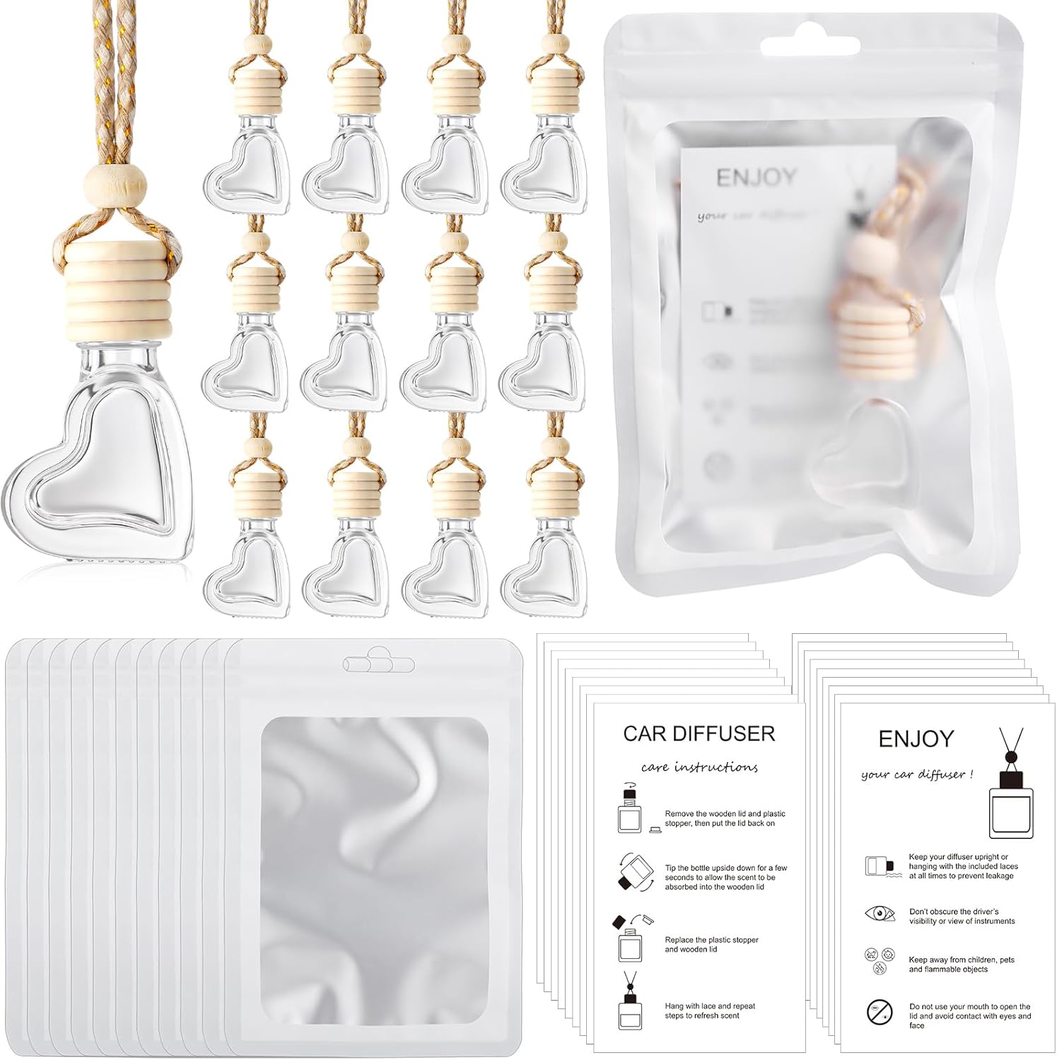 Features: The bottle comes with a stopper and adjustable hanging string. The wood cap absorbs fragrance and releases it slowly, ensuring long-lasting scent diffusion when filled with your favorite oils or air fresheners. The combination of clear instructions and convenient packaging makes it easy for you to use and enjoy the fragrances without hassle. Specifications: Material: wood and glass Color: Bottles: clear Instructional cards: white Sealable bags: white Size: Bottles: about 8 ml in capacity Instructional cards: about 3.54 x 2.13 inches/ 9 x 5.4 cm Sealable bags: about 4 x 6 inches/ 10.5 x 15 cm Package includes: 100 x Bottles 100 x Instructional cards 100 x Sealable bags Notes: Manual measurement, please allow slight errors on size. The color may exist a slight difference due to different screen displays. Do not load inflammable and explosive substances. Do not use open flames in the car. Avoid placing in high temperature environment. Check the volatile holes regularly. Do not block the driver's sight.
