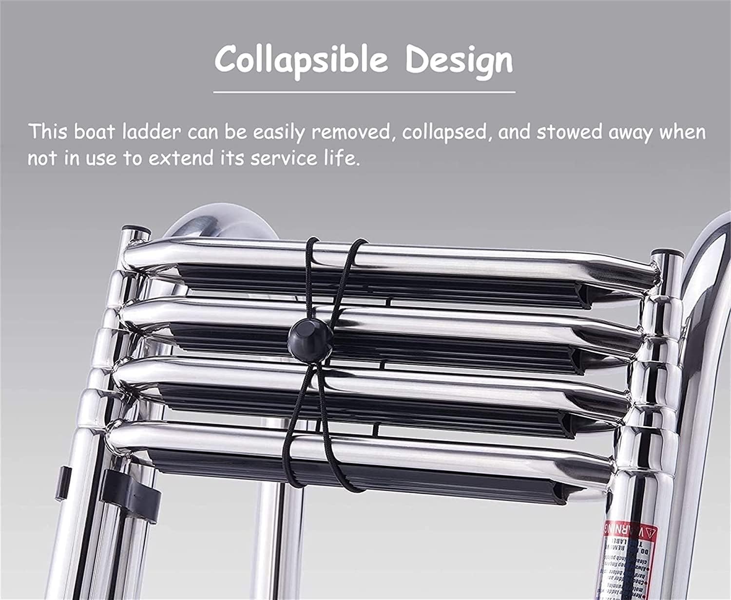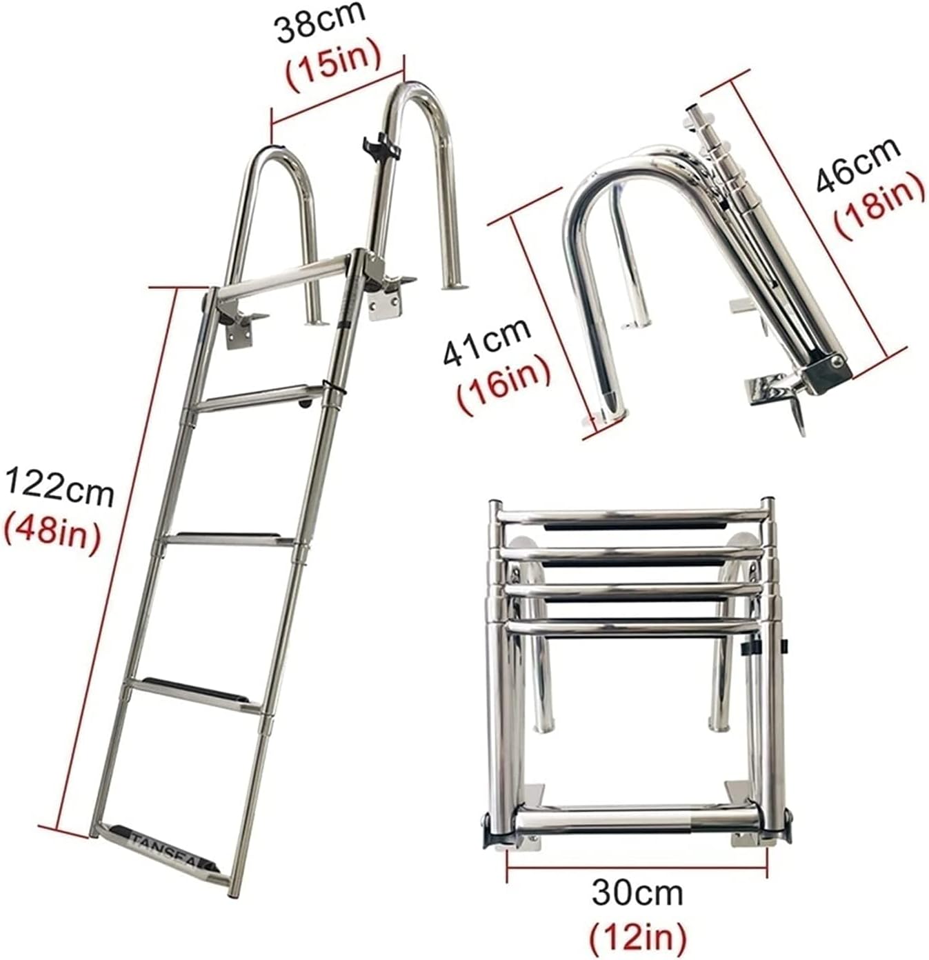 - Telescopic Platform Boat Ladder 1. This telescopic boat ladder is made to be bolted to a horizontal platform such a the boat floor or side railings depending on the installation. 2. The design of this platform ladder makes it possible to be used as on a pontoon boat. 3. Some of customers have also used this as a low profile dock ladder. 4. Installation is very easy, simply bolt the ladder to a horizontal platform and you are ready to use it! - Specification Material: 316 Stainless Steel Unfolded Height: 116cm Folded Height: 41cm Ladder net weight: 8kg Maximum user weight: 330 lbs - Most Liked Features: For both individual and professional use Durable, and rustproof it's well worth the money - Technical Features: 1. Steps telescope closed; flips up for easy storage. 2. Extra wide telescoping steps for more comfort when boarding. Easy boarding. 3. Heavy duty welded stainless steel pontoon ladder. Unique universal self supporting design requires no support. - Please Note: Do not place your hands or fingers between the rung when closing the ladder. - Package Contents: 1 x Boat Ladder