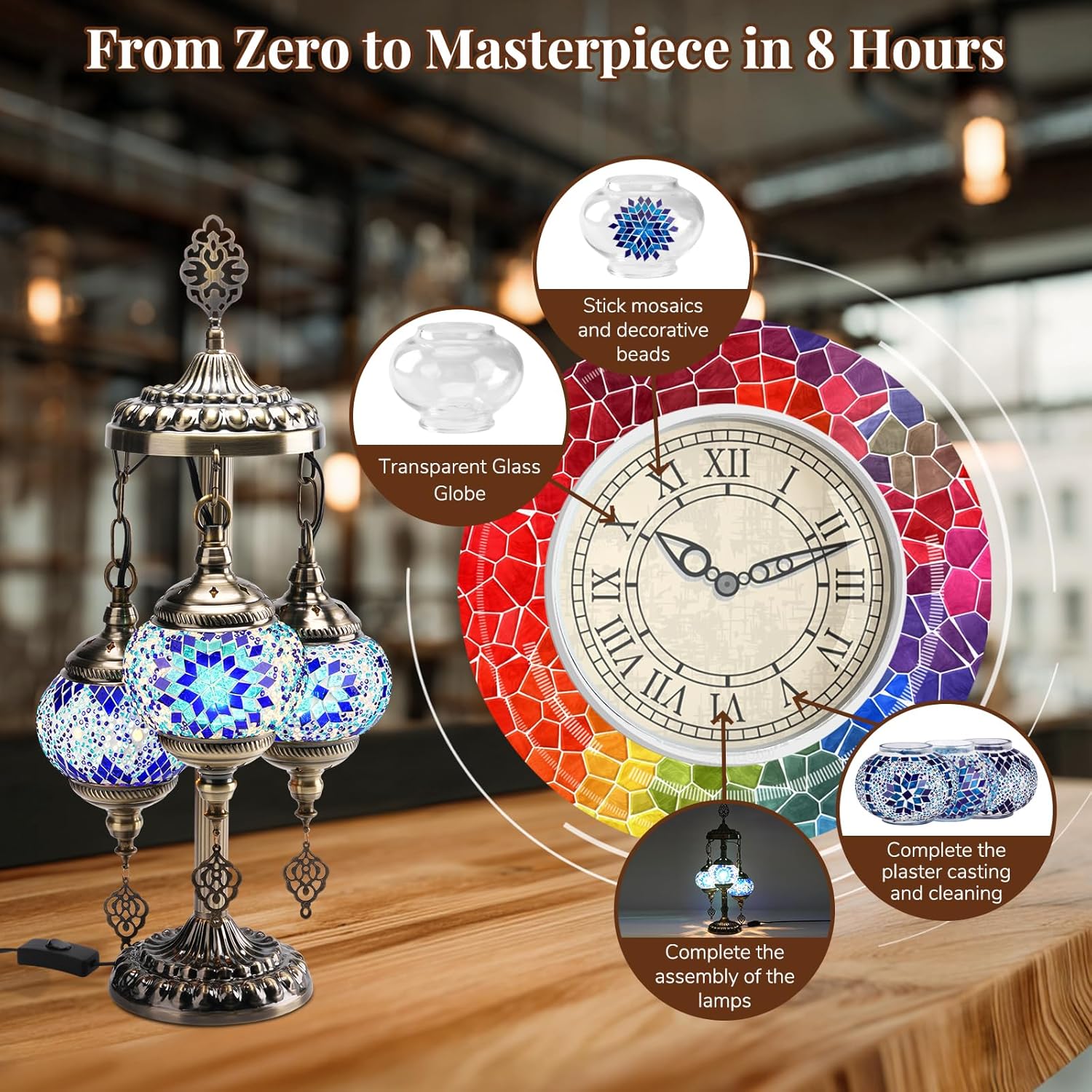 | Included Components | Lamp Body, Glass Shade, LED Bulb, Mosaic Tiles, Beads, Glue , Plaster Powder , Gloves, Bowl , Measuring cup, Spoon, Stir stick ,Sponge, Instruction Manual, Design Template |