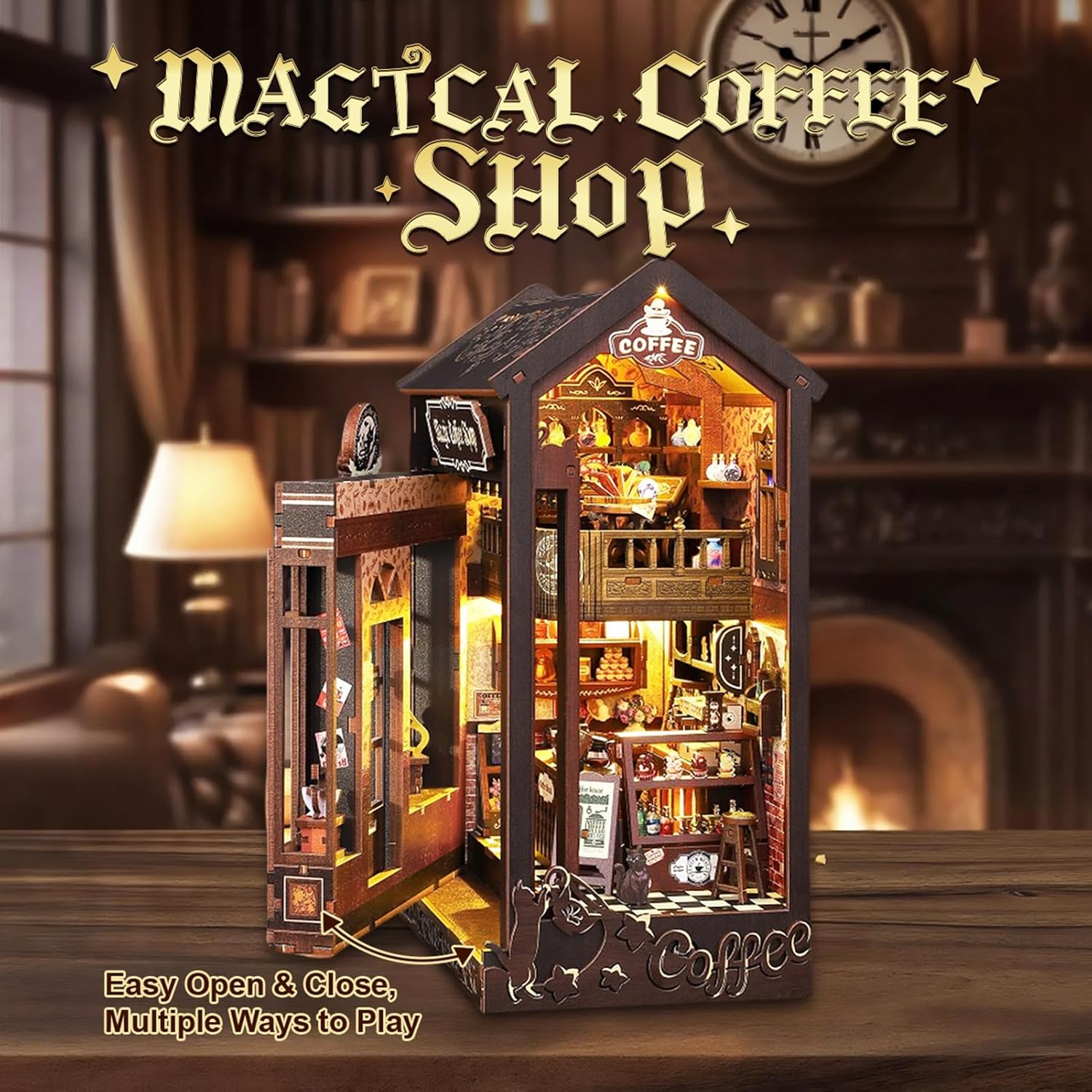 Book Nook Kit for Adults and Teens, DIY Miniature House Kit with Led Light, 3D Wooden Puzzles for Adults, Wood Gifts for Family and Friends on Halloween(Magic Coffee)