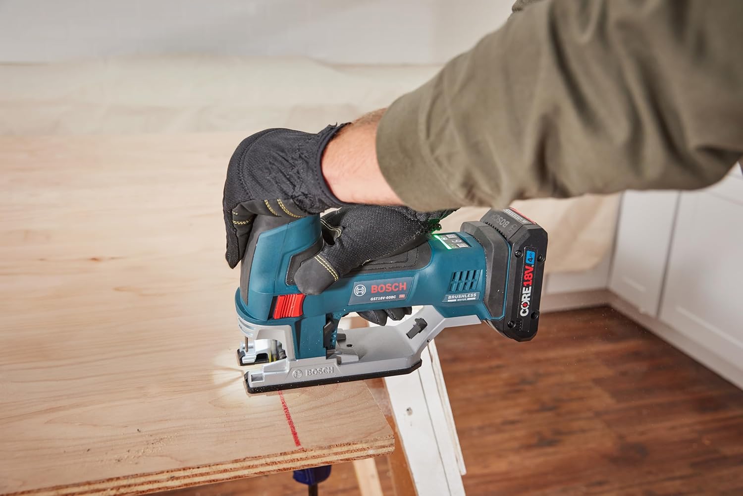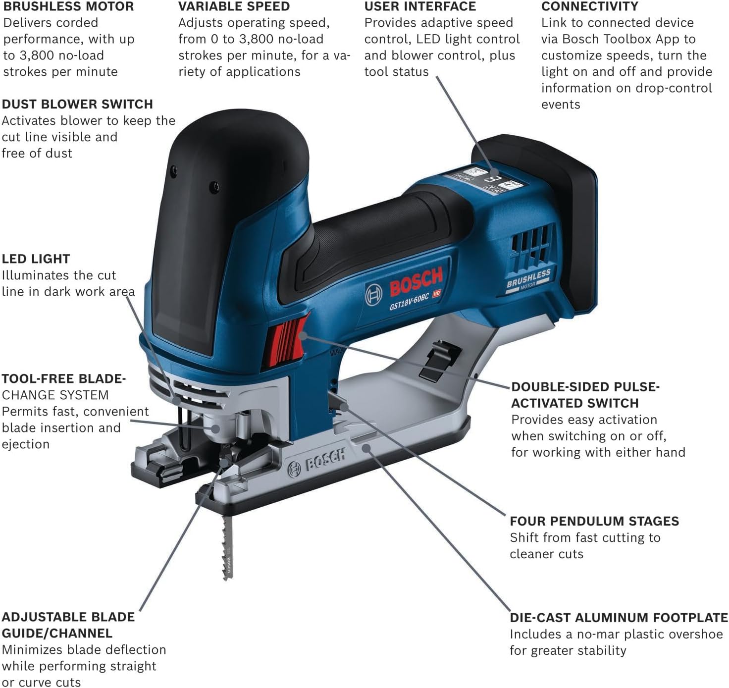 This 18V cordless jig saw is optimized for curve cuts, even through thicker material. The Bosch GST18V-60BC 18V Barrel-Grip Jig Saw features a brushless motor that delivers corded performance, with 0 to 3,800 strokes per minute speed. This barrel-grip jig saw provides an easy-to-reach pulse-activated double-sided switch to accommodate working with either the left or right hand. It features an adjustable blade guide/channel, which minimizes blade deflection while performing straight or curve cuts. The jig saw has four pendulum stages, to shift from fast cutting to cleaner cuts. Connecting to the jig saw allows user to pre-select speeds, turn the light on and off, and provide information on drop control events via Bosch Toolbox App. This jig saw features an adaptive speed-control setting, which will dial down the strokes per minute to control the entry point of the blade and the workpiece. Once the saw blade touches the workpiece, the jig saw will resume the selected speed, to provide the best control and precision. This jig saw also features a blower that can be switched on and off. The jig saw is compatible with guide rail and circle adapter. The jig saw has extended upfront soft-grip areas and a small barrel-grip circumference for greater tool control. The cut lines stay visible due to the dust blower and LED light. The jig saw features a tool-free T-shank blade-change system. The large die-cast aluminum footplate with no-mar plastic overshoe to help prevent damage to the workpiece.