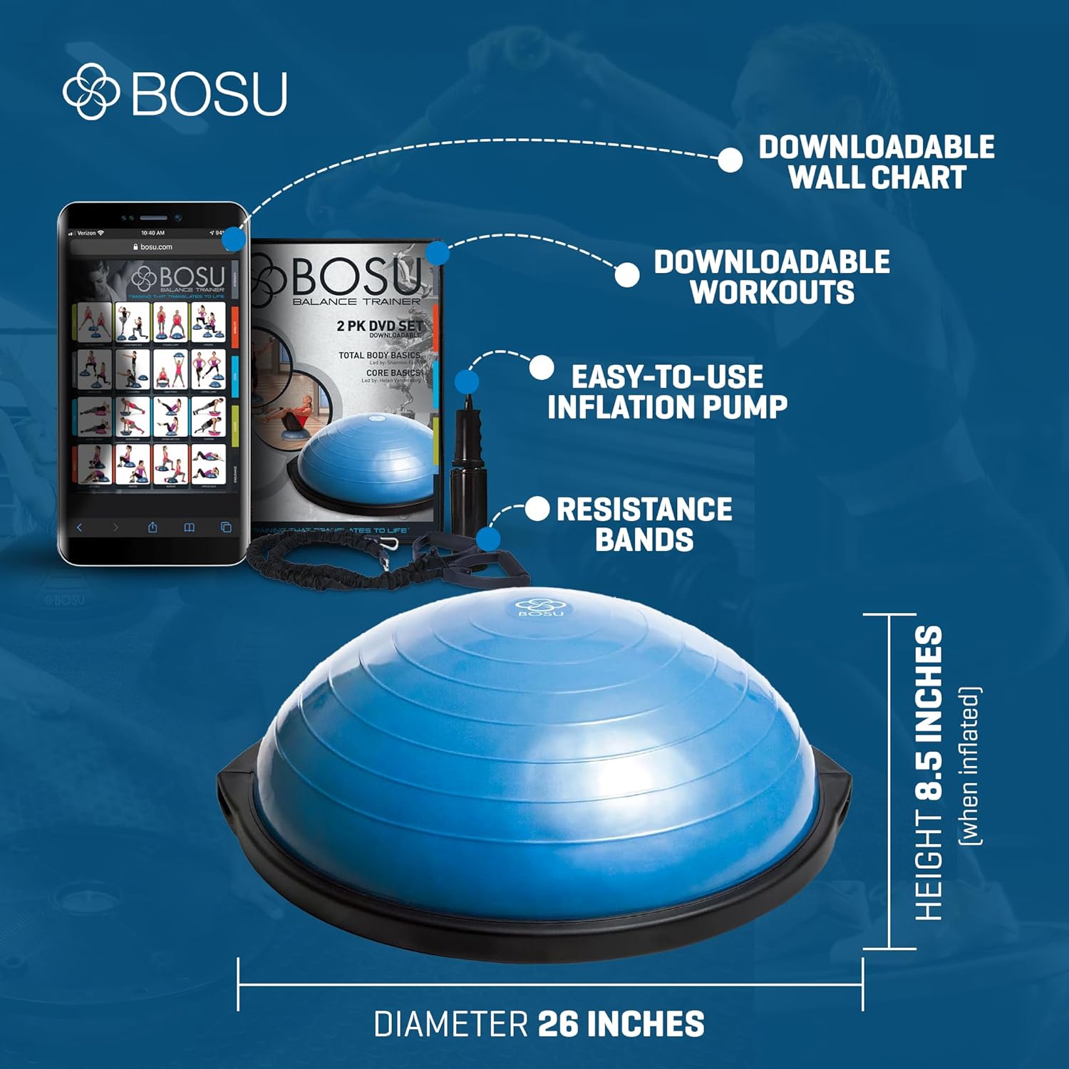 | Included Components | Bosu Balance Trainer, instruction manual and pump |