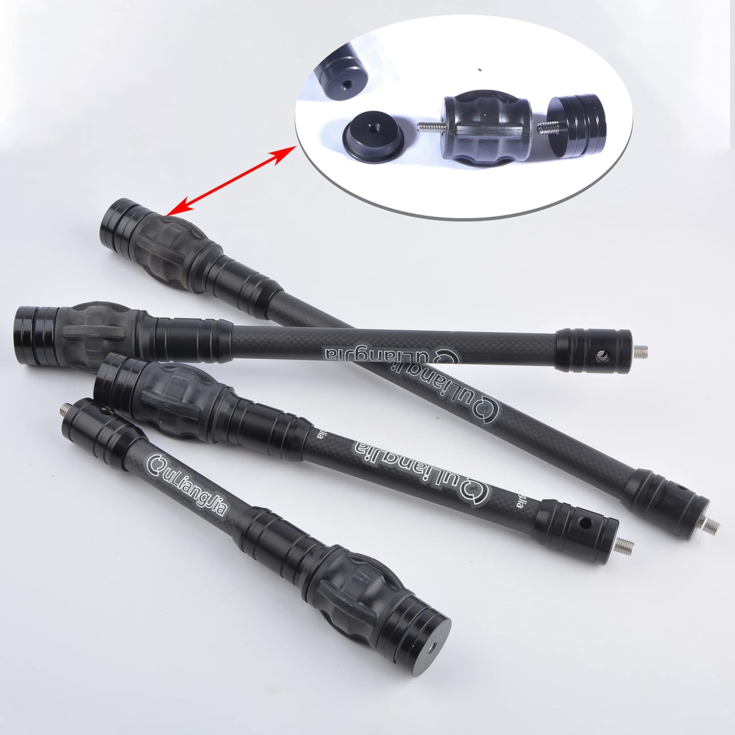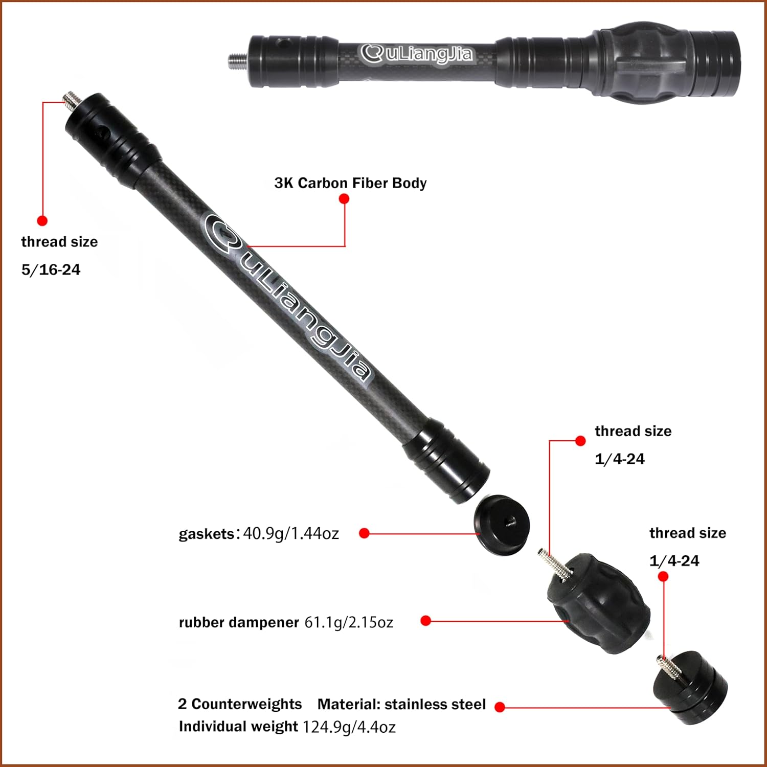 Product name: Archery stabilizer RodMaterial: 3K carbon materialWeight: 268.2g (6 inch)/272.5g (8 inch)/275g (10 inch)/280.4g (12 inch)Product size: 6 inch(23.5x4x4cm)/8 inch(28.5x4x4cm)Features: Comes with detachable counterweight and shock-absorbing ballPacking: 1xArchery stabilizer Rod