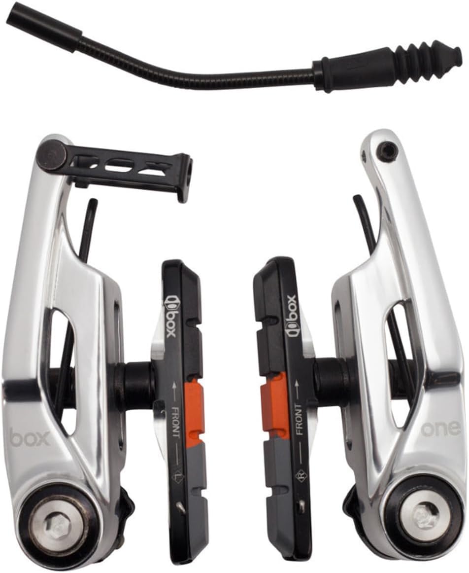 For Box One braking weโve limited the use of our Oversized Technology to the V area since the BMX Brake levers need to be minimalist and largely act as a remote for the V-Brakes. To reduce lateral deflection at the V we chose to enlarge the pivot areas and arms while tightening tolerances at their interfaces. We transferred material from unloaded sections to reinforce these zones of high stress. Not only are you going to be more efficient with Bike Brakes Rear power delivery, but youโll also feel the instant response of deceleration.๐นKEY DIFFERENCES: The Box One V-Brake are the only BMX Brakes for Bikes in the Box line-up to be blessed with Oversized Technology. They are also the only model to use sealed precision bearings to further reduce non-rotational movement. The 108mm long-reach brakes are excellent for BMX, Mountain, City, Urban and Tandem Bicycles using linear-pull-compatible levers. The 85mm short reach (AKA mini-V) brakes are an excellent choice for cyclocross or drop-bar gravel bikes.๐น FEATURES: ๐ง Oversized Technology ๐ฉ Precision Sealed Bearing Pivots ๐ ๏ธ Titanium And Stainless Steel Hardware ๐ Allen Key Tensions Bolt ๐ง Inset 2nm Allen Key To Secure Cable On Right Arm ๐ Flexible Cable Noodle ๐ Streamlined Cable Fixing Point ๐จ Arms Are Cold Forged ๐ 35 Millimeters Of Vertical Brake Pad Adjustment ๐น IMPORTANT NOTES: 85mm Arm = <1 x 1/8 tires 108 mm Arm = >1 x 1/8 tires ๐น SPECIFICATIONS: ๐ ๏ธ Material: 6061-T6 Aluminum ๐ฉ Hardware: Titanium ๐ Origin: Designed in USA / Made in Taiwan ๐จ Finish: Anodized w/Laser-Etched Graphics โ๏ธ Weight: 85mm: 189g / 6.7oz, 108mm: 198g / 7oz