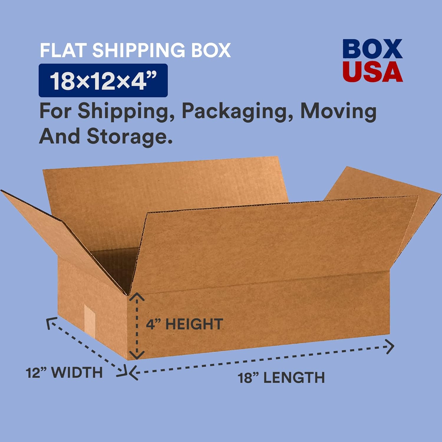 18 x 12 x 4" Flat Corrugated Boxes. The smaller depths on these cartons provide an ideal fit for shallow products. Perfect for shipping apparel, books, picture frames, artwork, mirrors and clothing. Boxes are manufactured from 200#/ECT-32 kraft corrugated. Corrugated boxes are reusable and recyclable. Cartons are sold in bundle quantities and ship flat to save on storage space and shipping. Proudly made in the USA