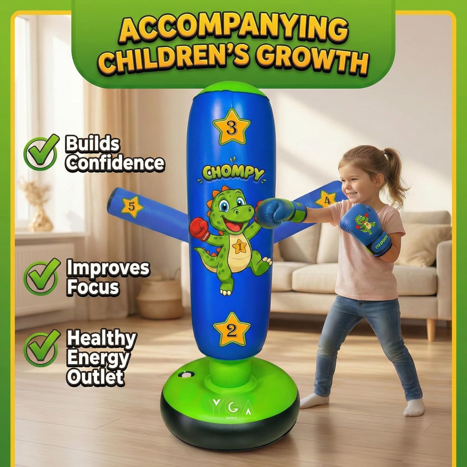 The Perfect Match for Big & Little Siblings Tailored Heights for Every Age Finally, a boxing set that grows with your family. This bundle includes one 48 inch CHOMPY for younger children (ages 3-6) and one 63 inch PUNCHO Ninja for older kids (ages 6-12). No more compromising on size. Ninja vs. Dino Training Whether they want to spar with a Ninja or train with a Dinosaur, this set offers variety that keeps kids engaged. Both bags feature strategic targets to help improve accuracy, speed, and focus. Professional Grade Durability Both bags are engineered from ultra-durable 0.5mm PVC that stands up to the toughest kicks and punches. The extra-wide stable bases ensure the bags stay upright through vigorous training sessions. Physical Play Anywhere Designed for indoor use, these freestanding bags fit easily in bedrooms or playrooms. They are the ideal screen-free solution for active kids who need to release frustration and build confidence. Bonus Training Material Your purchase includes our exclusive digital eBook featuring martial arts drills and fun games, helping your kids get the most out of their new ninja and dino friends.