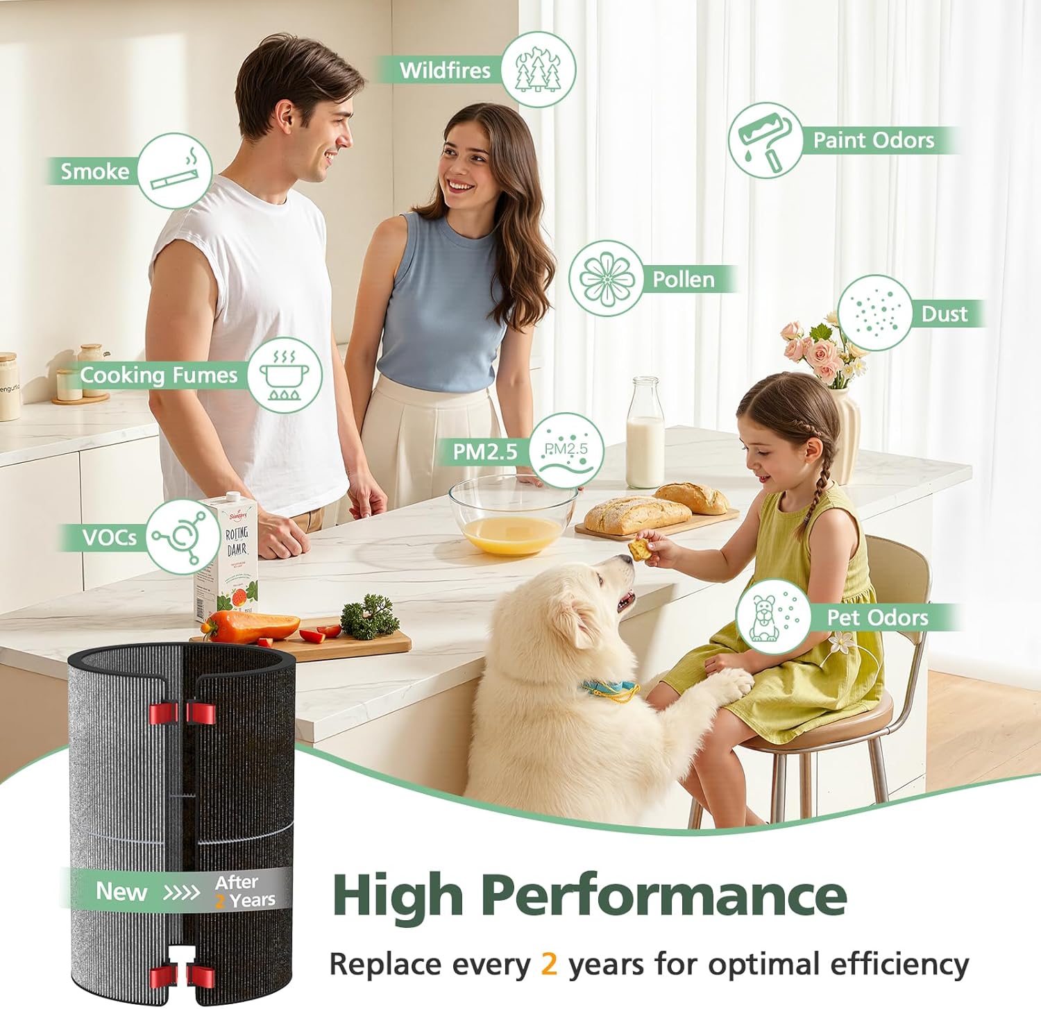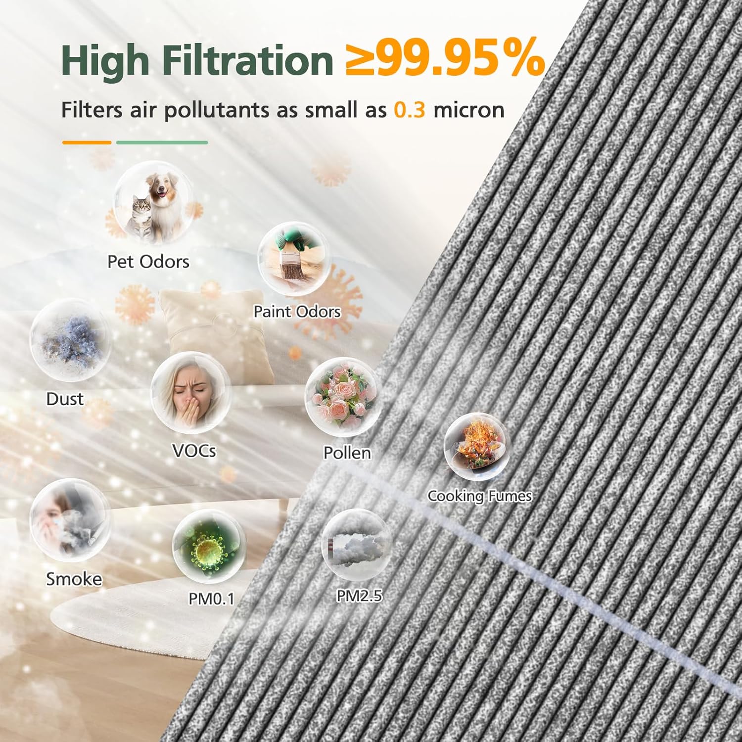 | Product Benefits | Removes dust, pollen, smoke, cooking fumes, pet odors, paint odors, VOCs, PM2.5, and other ultrafine particles and odors |