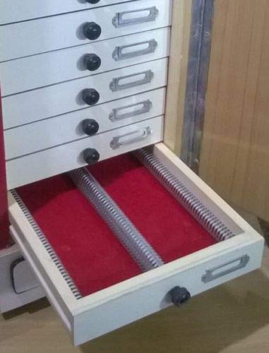 Made of wood frame with non warping ply wood with Mica Top & door made from non-warping wooden board with Mica Clad front and polished inside secured with quality hinges and a Lock & key at the front door. In the cabinet are 10 polished wooden slide trays each having a capacity of 100 slides Made from Soft Seasoned wood of Superior quality the Slide grooves are made from superior quality wood with smooth cut each having numbered sticker. Each slide tray also has a knob for easy handling and a metal plate socket at the front for holding Index for easy numbering of slides. At the bottom of your slide cabinet there is a wooden drawer with fine quality wood having superior cloth lining at the bottom. For storing 1000 standard 75mm x 25mm microscope slides in individually numbered grooves. Holds 100 slides in each tray. 5 trays in the Cabinet Approx Size: 23 x 46 x 30 Cm, Outer size Weight of cabinet is an approximate of 19 pounds