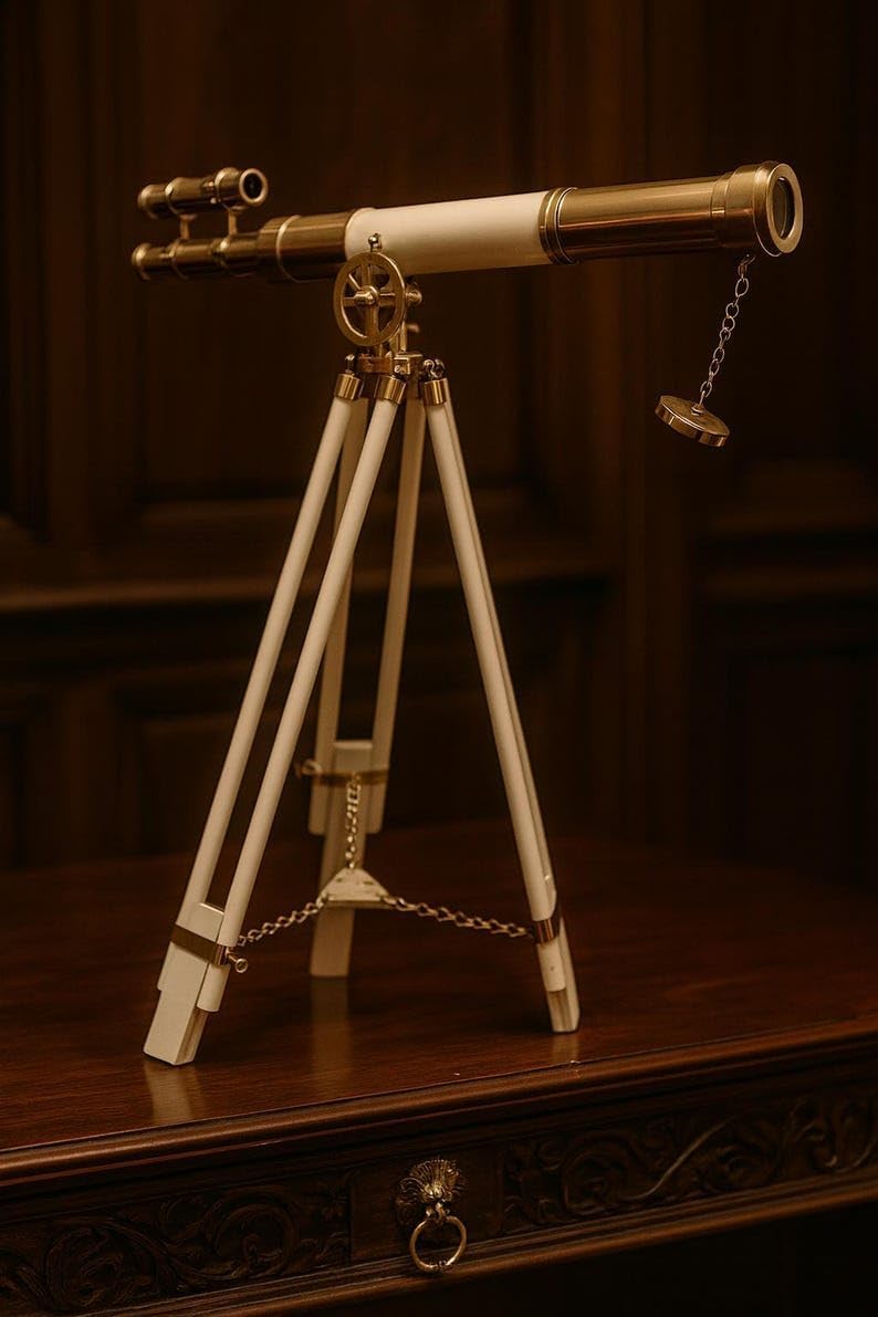 Tube Length: 63.5 - 71.12 cm Height: 132.08 cm Ground Diameter: 63.5 cm Material: Brass, Glass Colour: White, Silver Theme: Nautical Net Quantity: 1 Count Magnification up to 42x, tube length 25 to 28 inches, height 52 inches, ground diameter 25 inches, weight 8 kg, nickel finish telescope, and white tripod are an ideal color combination for the home. It is built of high-quality brass and wood. Quality is a parameter on which we do not compromise. We provide our clients with high-quality, beautifully designed goods that work well. The ideal center piece of history to complete any decor in your home or office. Incredibly popular corporate gift or an excellent addition to your collection of superb antiques. The Nautical chrome finish White Tripod Telescope is a fully functional nautical masterpiece, tastefully mounted on a wooden tripod. Brass Telescope Floor Standing Tripod Telescope Retro White Finish Antique Astro Educational Instrument Home Office Decor