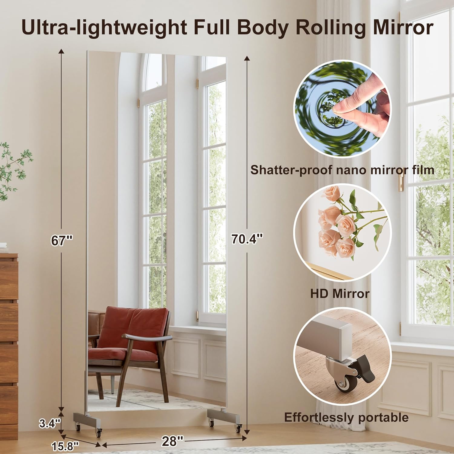 Transform your space with this stunning floor and full length mirror, a perfect blend of functionality and style. This versatile mirror serves as both a practical dressing companion and an elegant design element that can make any room feel more spacious and bright. Whether placed in your bedroom, dressing area, or entryway, it provides a complete head-to-toe view for outfit checks and final touches. The mirror's sleek design complements any decor style, from modern minimalist to classic traditional. Its generous dimensions ensure you can see your entire ensemble at once, while the thoughtful construction makes it easy to position for optimal viewing angles. Perfect for daily grooming, fashion decisions, or adding depth to your living space, this mirror is an essential addition to any home. The clean lines and timeless appeal make it a sophisticated choice for those who appreciate both form and function in their home decor.