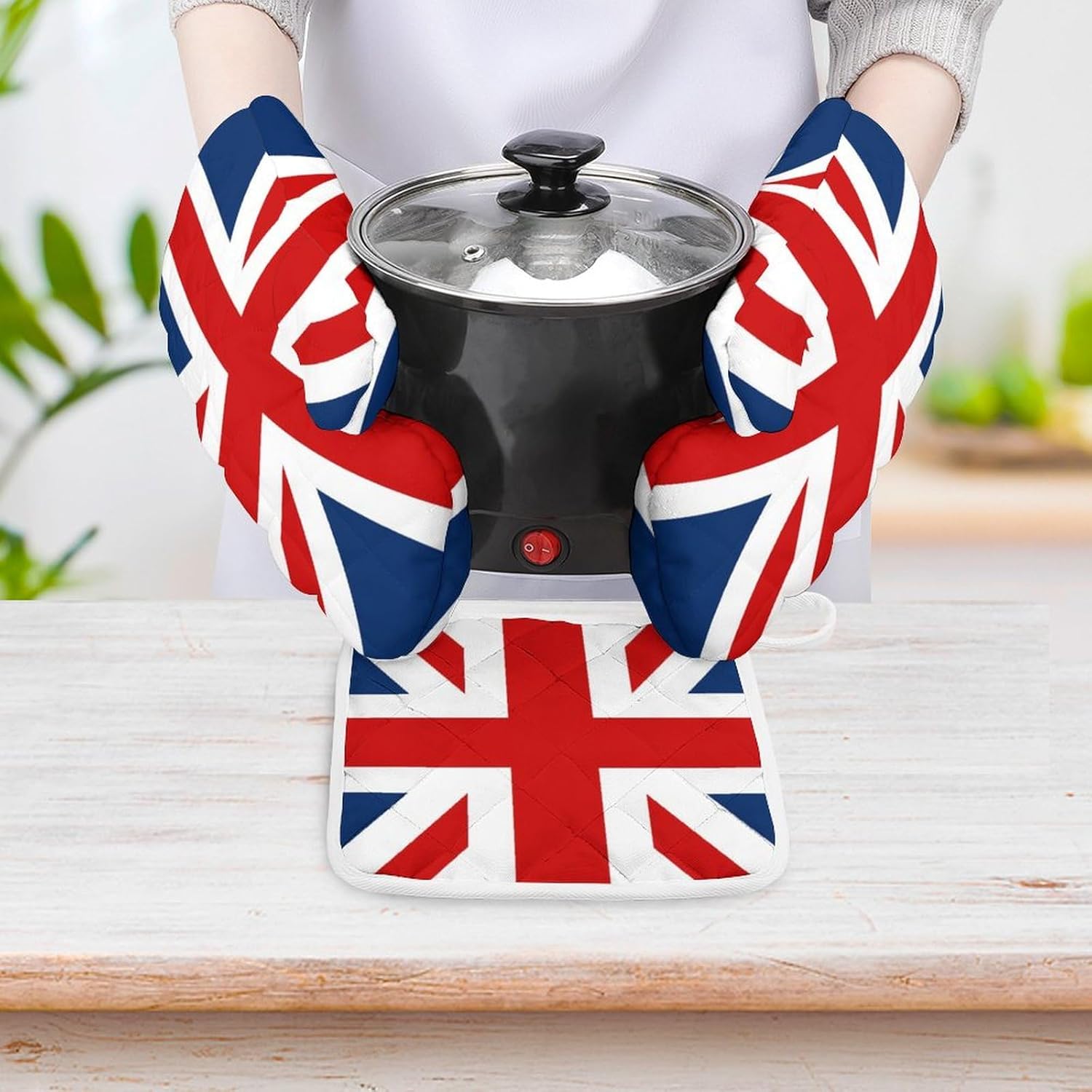 This 3-piece oven mitt and pot holder set is made of washable and reusable fabrics and is suitable for use when cooking and baking in the kitchen such as hot pots, barbecues, and microwave ovens.