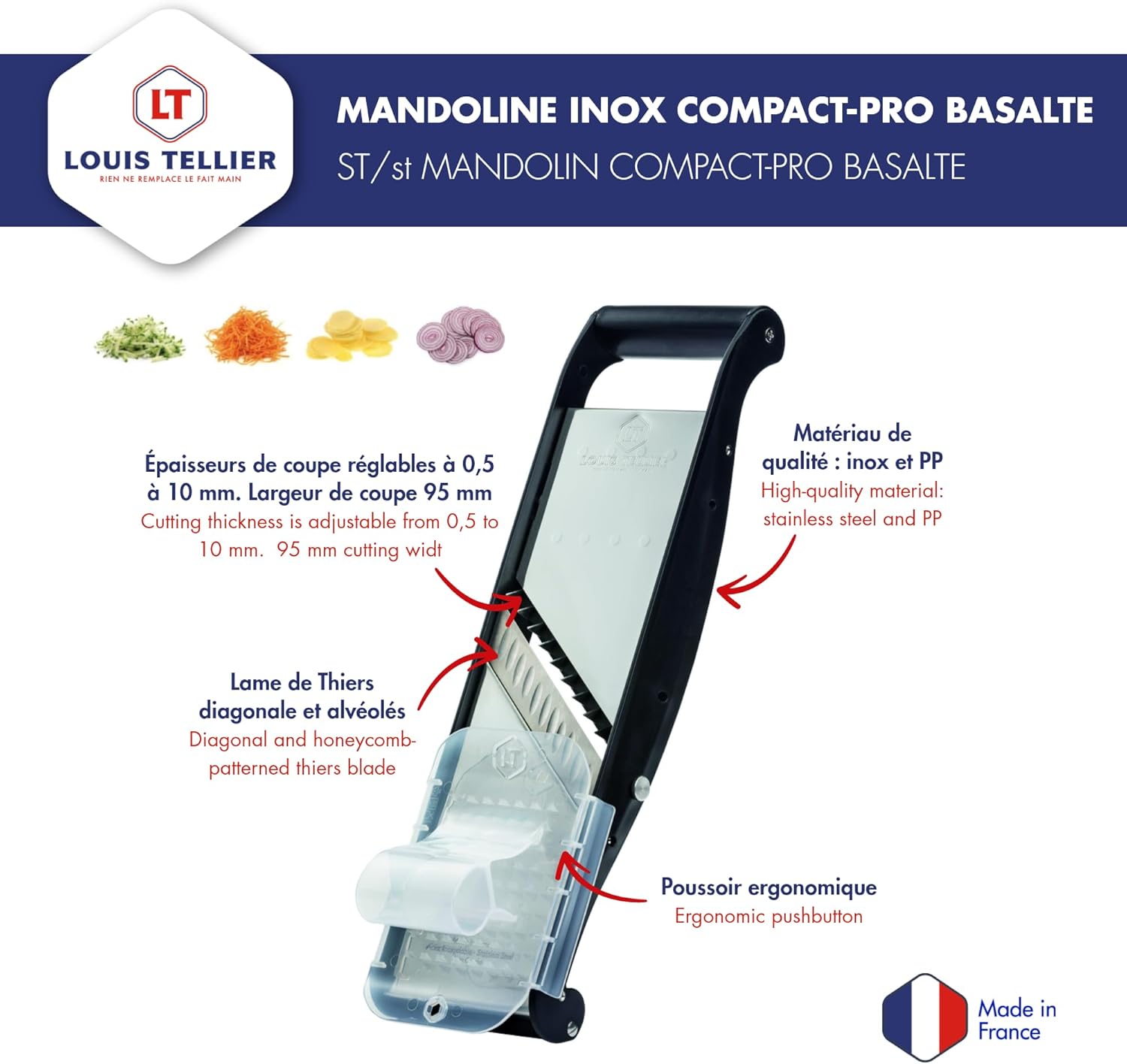 • JAPANESE CRAFTSMANSHIP: Lightweight and easy to handle, the Compact-PRO BASALTE is equipped with a diagonal, serrated blade made in Thiers, which reduces vegetable sticking during slicing. The exceptional quality of this blade and the combs ensures precise and fast cutting.