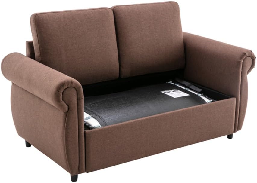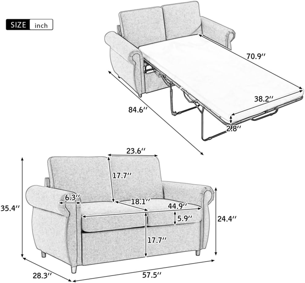 Versatile Pull Out Sleeper Sofa: Accommodate your guests, have your kid’s friends for a sleep over, or make a quick set up even in the office to catch your noon snooze. Mechanism to ensure conversion between seating / sleeping positions.This sofa mattress is carefully designed with memory foam, providing unmatched comfort and quality. The memory foam conforms to the body, aligning the neck and spine, allowing the user to relax and enjoy a good night's sleep.With premium quality steel tubing, reinforcements, and stabilizing legs, the steel folding cot sturdily maintains balance with no worry of toppling over.Breathable linen fabric and high-density foam upholstery give a soft feeling and excellent support.This loveseat sleeper features gives it a minimalist feel that can perfectly match with your home decor. The compact design makes the sofa for apartments, dorms and studios.Upholstery Material:LinenFrame Material:PlywoodSeat Construction:Pocket Spring+FoamLeg Material:Rubber woodSize: as shownSet IncludesLoveseat + Mattress(no other presentation items included).Notice:1. Due to manual measurement, please allow 2-3% error, before you bid, please make sure you don't mind.2. The color may vary due to different displays, please refer to the actual product.