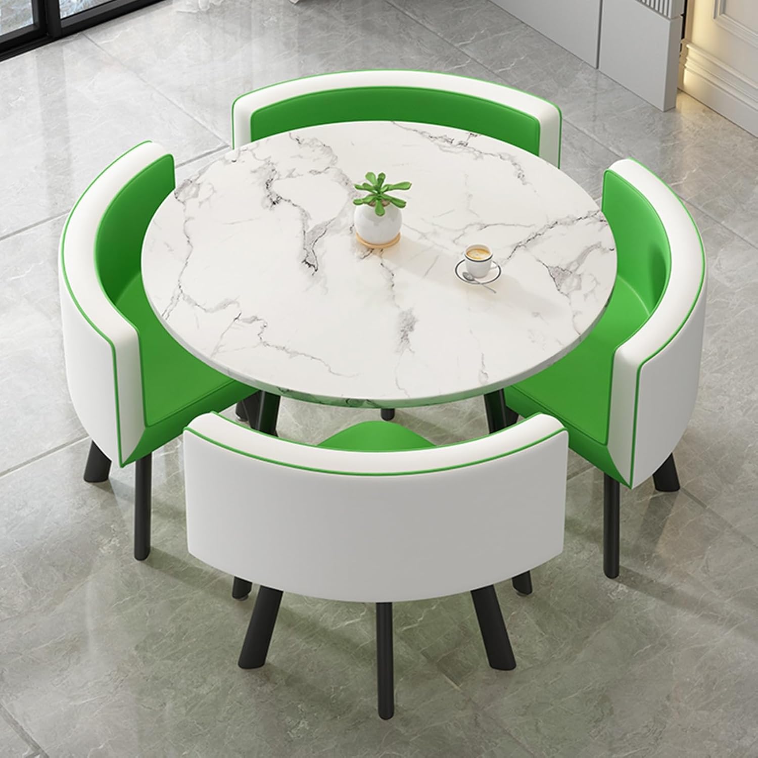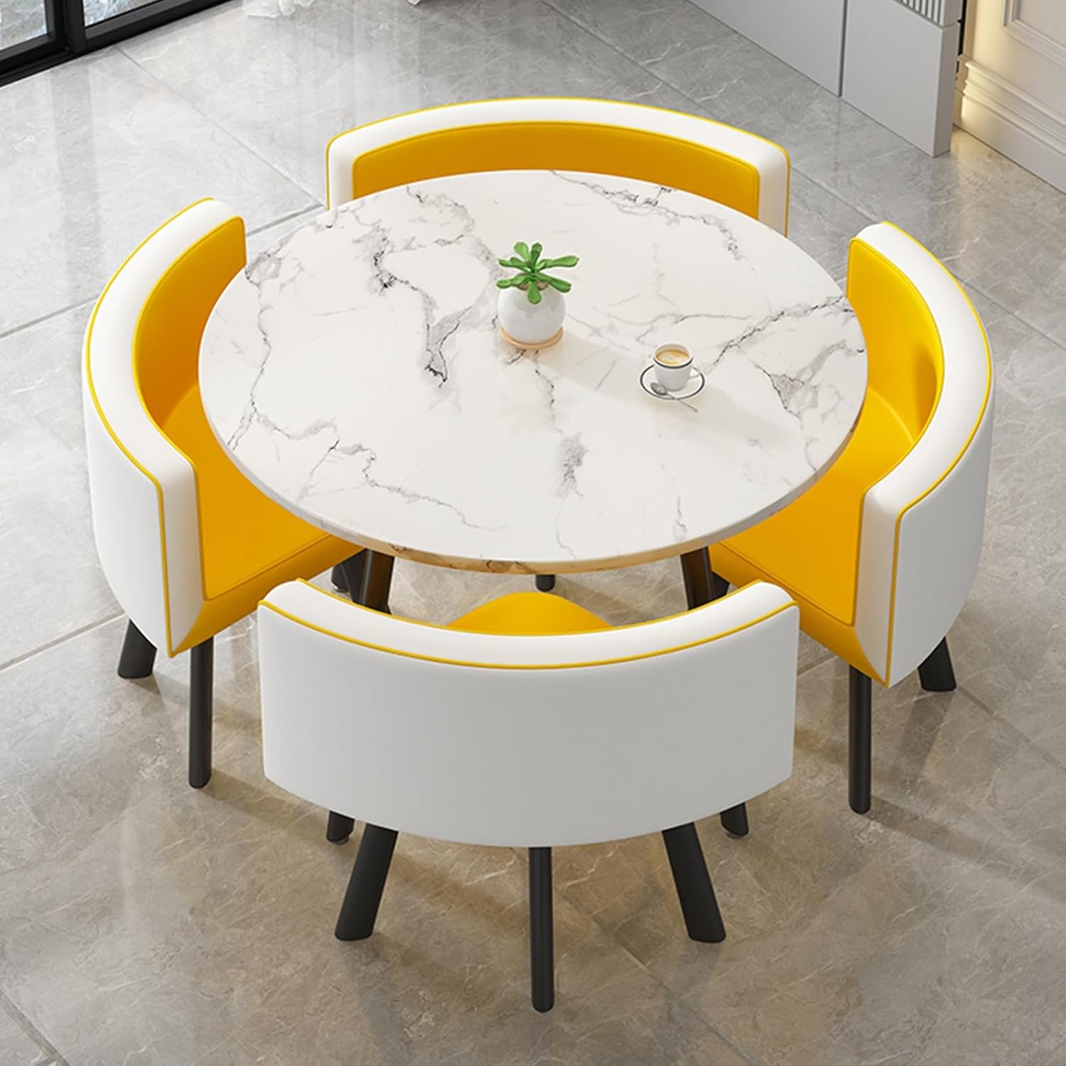 - Product Name: Table and chair combination- Color Options: Yellow, Green, Orange, Black, Light yellow, Pink, Blue, Brown, Gray, Red- Features: Simple, generous, space-saving- Style: Simple and modern- Bracket structure Material: Metal- Table shape: Round- Desk top material: Wood-based panel- Table top diameter: 80 cm/31.4 inches- Chairs material: Leather- Total chair height: 73 cm/29 in- Applicable scenes: Office, coffee shop, tea shop, reception, restaurant, library, cinema, clothing store, maternal and child shop, living room, etc.- Applicable number: 4 people- Packing method: Assembly- Packing list: 1 table, 4 chairs (decorations not included)Warm Tips:1. Size Description: Hand-measured products may have a 1-3 cm error. Please refer to the actual items received.2. Picture Description: The product is real, but slight chromatic aberration may occur due to light, angle, and display. Please forgive any discrepancies. Revamp your space with this versatile and practical dining set.