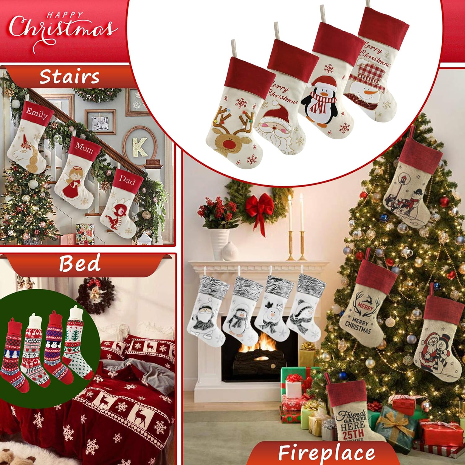 The Christmas stockings are made of high quality linen cloth with delicate appearance and exquisite workmanship. The linen cloth which is soft and safe. The Christmas stocking also have an inner lining, it is very smooth which makes the stocking easy to put in and take out gifts. And the soft double felt cloth makes the whole stocking strong and durable.