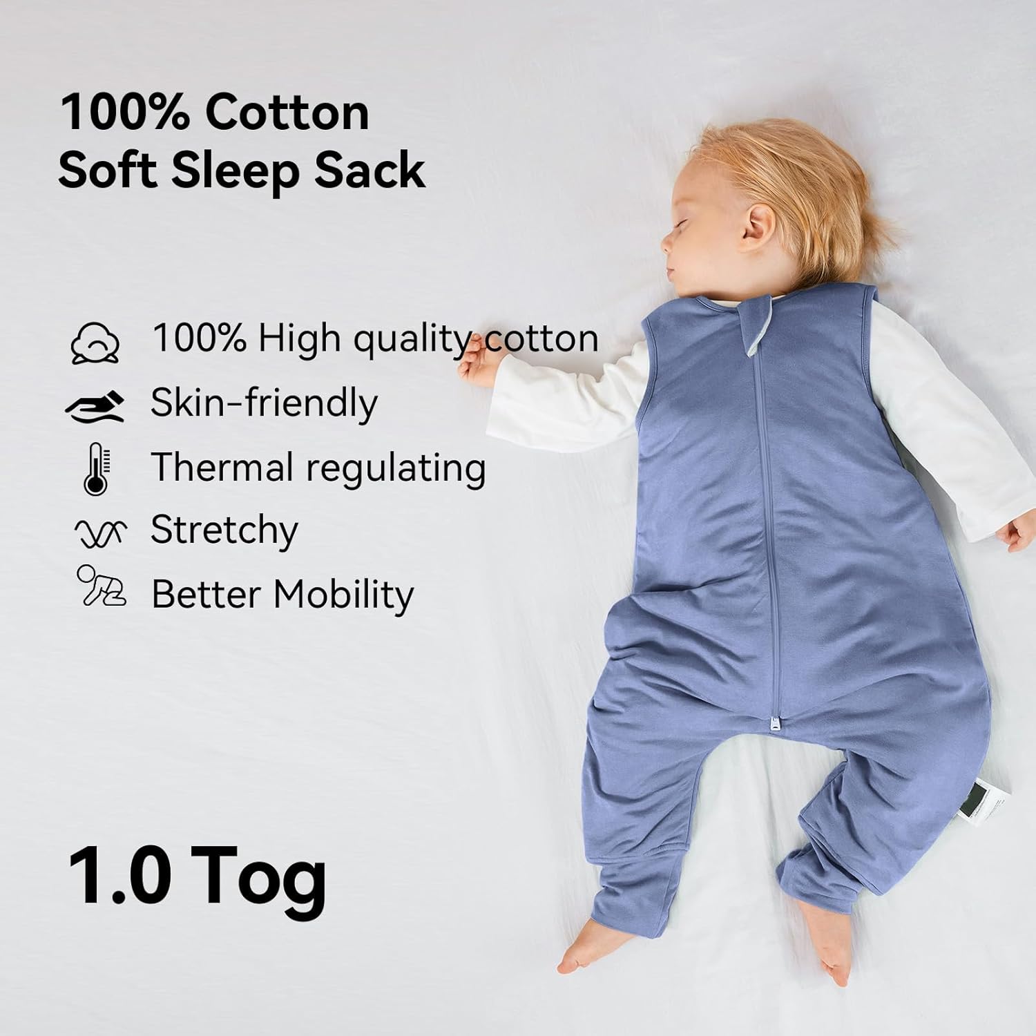 BubblePanda's toddler sleep sack with feet is a game-changer for both babies and parents. Crafted with care, it's made from soft and hypoallergenic cotton fabric, ensuring a cozy and breathable environment that regulates body temperature and wicks away sweat. The soft cotton fabric is gentle on delicate skin, outperforming fleece in terms of softness, breathability, and moisture absorption. Safety is paramount, with a deep, narrow neckline and zipper protector, while the breathable fabric prevents overheating. Designed for convenience, the 2-way side zipper simplifies midnight diaper changes, and the roomy leg space promotes healthy hip development. Plus, it's machine washable and built to last.