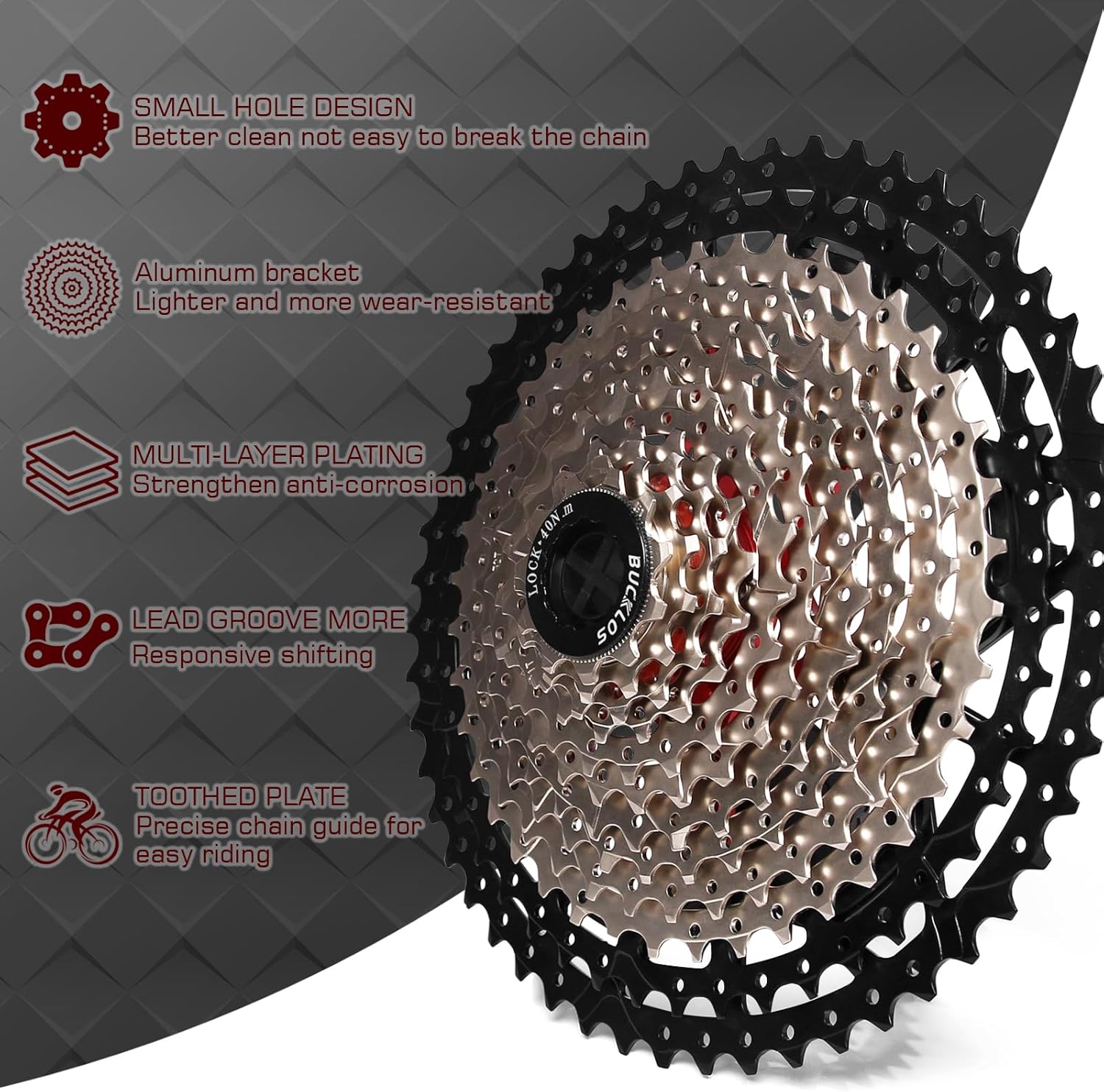 • 【Easy to install and clean】BUCKLOS 8/9/10/11/12 speed bike cassette surface coating and small hole design is easy to clean, easy to install, and the gears are easy to remove and replace