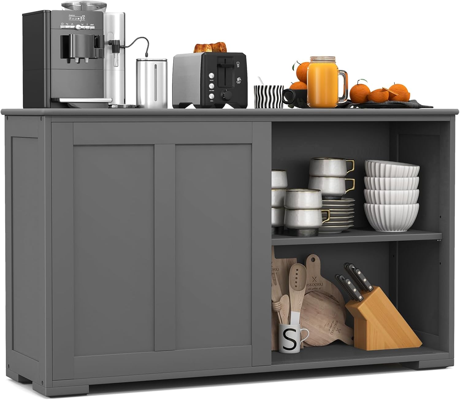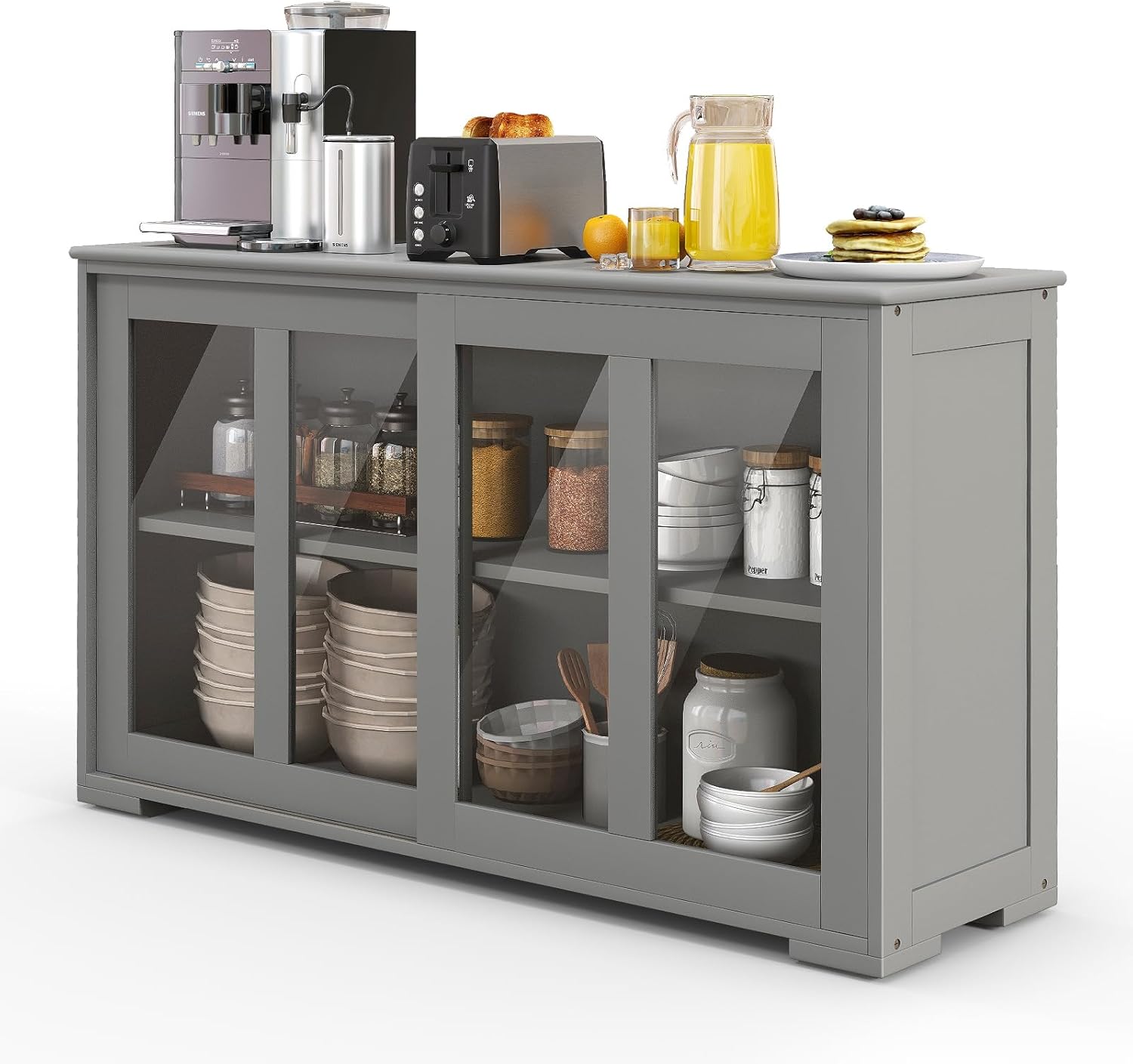 Description:Enhance your home with this chic and versatile sideboard that effortlessly merges with your current decor to elevate the sophistication of any room. Not only does it serve as a stylish piece, but it also organizes your belongings with its efficient storage design.Easy-to-slide doors with tempered glass accents showcase your cherished items and instantly elevate the ambiance of the room. With three adjustable shelves, this sideboard offers flexibility to accommodate items of various sizes. Crafted from durable materials, this cabinet ensures long-lasting quality and is simple to maintain with a quick wipe.This multifunctional piece of furniture can be used as a bookcase, coffee table, console cabinet, storage unit, or shoe organizer, catering to your needs regardless of the space. Elevate your home decor with this stylish and practical sideboard today.Features:Can function as a versatile buffet cabinet, console table, coffee bar, storage cabinet, and bookcaseSpacious counter for additional storage or elegant displaySliding tempered glass doors save space and provide a clear view of your belongingsHeight-adjustable shelf with 3 positions for storing various itemsSturdy legs protect your floors and ensure stabilityStackable design maximizes space utilization and allows for vertical storage expansionPerfect for various room sizes and purposes, from dining room to kitchen and beyondSpecification:Color: As shown in the picturesMaterial: MDF, Transparent Tempered GlassOverall Size: 42" X 13" X 24.5" (L x W x H)Net Weight: 51 lbsWeight Capacity of Cabinet Top: 90 lbsWeight Capacity of Adjustable Shelf: 50 lbsWeight Capacity of Bottom Shelf: 100 lbsTotal Weight Capacity: 240 lbs Package includes:1 x Kitchen Sideboard1 x InstructionsWhy You Choose Our Buffets & Sideboards?√ Sliding tempered glass doors not only unique and beautiful, but also space-saving.√ Stackable for added storage space and defining unique furniture.√ Provide abundant storage and flexible options, including a shelf that can be adjusted to three heights.
