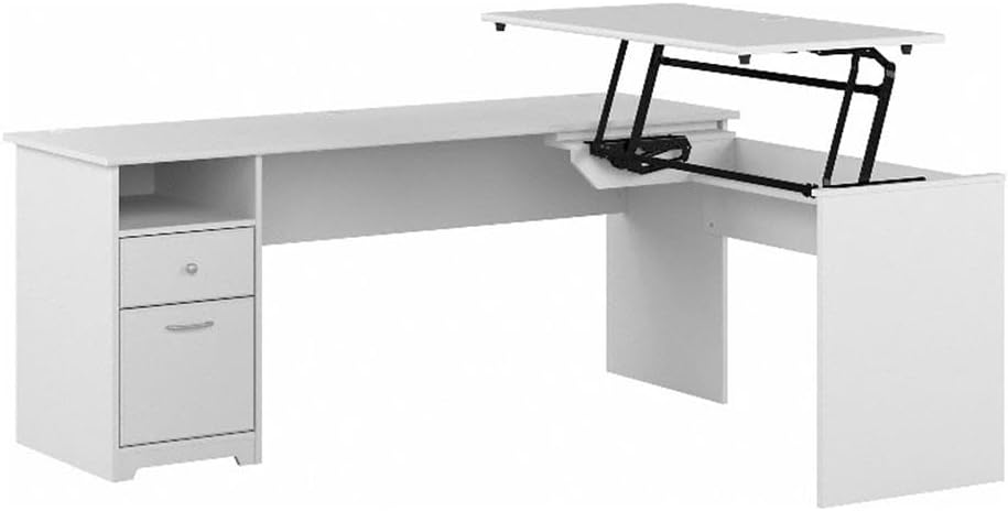 The Bush Furniture Cabot 72W 3 Position Sit to Stand L Shaped Desk presents an ergonomic home office solution with transitional style. Enjoy the freedom to change positions quickly and easily throughout the day with a convenient Lift-n-Lock desktop that adjusts to three standing desk heights: 37, 40, and 42 inches from the floor. The adjustable desk surface supports up to 20 pounds when extended so you can take materials with you while giving your back and neck a break from sedentary work. The fixed work surface features built-in wire management and has a weight capacity of 200 pounds to accommodate multiple monitors and equipment. A single file drawer opens on smooth full-extension ball bearing slides for an effortless reach to letter, legal, and A4-size paperwork. A box drawer organizes writing utensils, notepads, and other small office supplies while the open cubby shelf is perfect for work-in-progress and frequently used materials. The ergonomic desk is finished on all sides to look great facing any direction in your home office. Stylish metal hardware complements your choice of several traditional and contemporary finish options for an appearance that works with your own space and taste. This sit-stand home office desk with storage has been rigorously tested to meet or exceed ANSI/SOHO standards for safety and performance and is backed by the Bush Furniture 1 Year Manufacturer's Warranty.