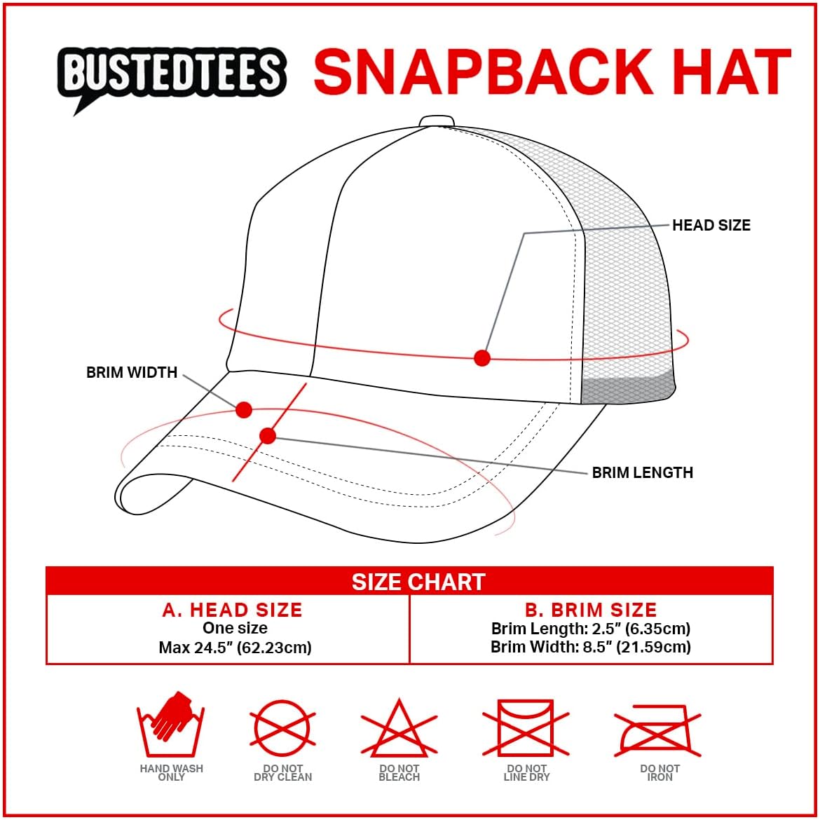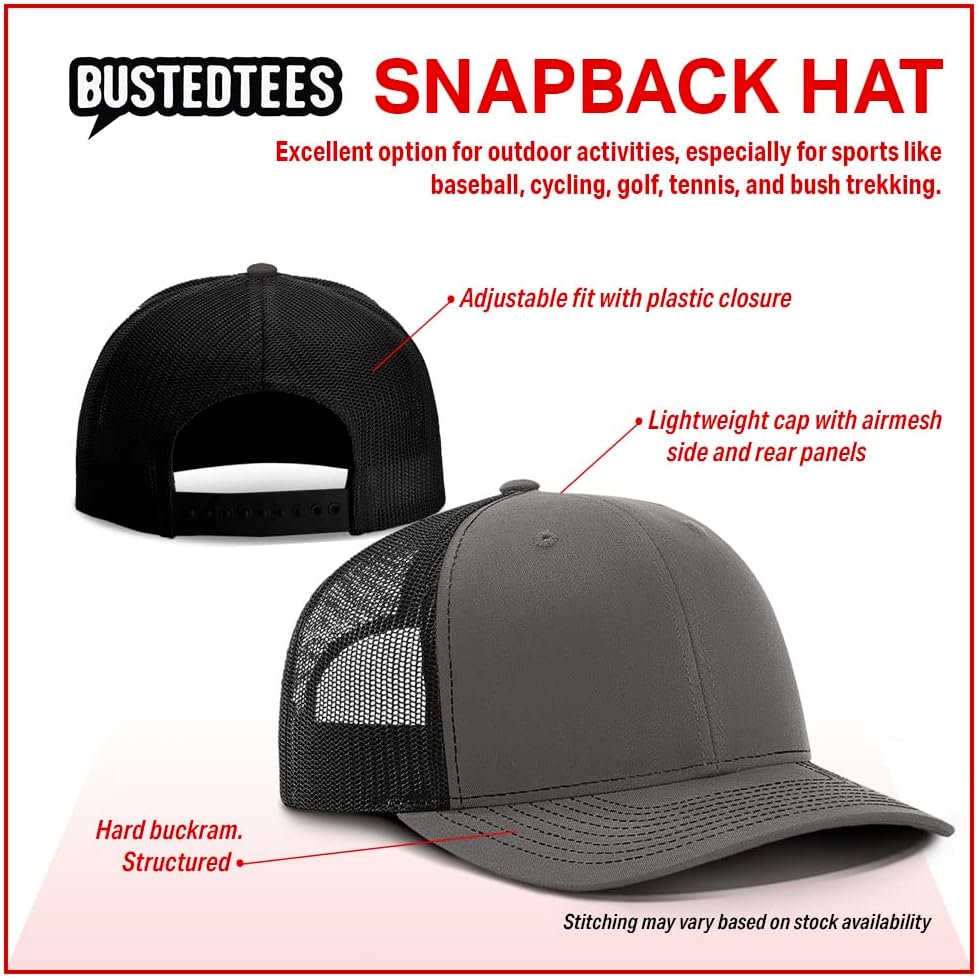 If you are looking for a comfy and stylish cap for outdoors. These Busted Tees customized baseball hats won't disappoint. Complete your rugged ensemble by sporting either Embroidered or a Leather Patch Hat. It flaunts a patched or emboirdery statement design of your favorite quotes or logo and emblem on the front part. It's 60% Cotton Twill front with 40% Polyester Mesh Back. Hats are carefully stitched together, skillfully patched with our designs, and shipped in a box to keep them safe till they get to you, making this cap an excellent headwear to wear on summer, warm days and any season. For optimal durability, please make sure to:Hand Wash and Air dry only If for some reason it does not disappear, please reach out to us immediately and we will take care of you!