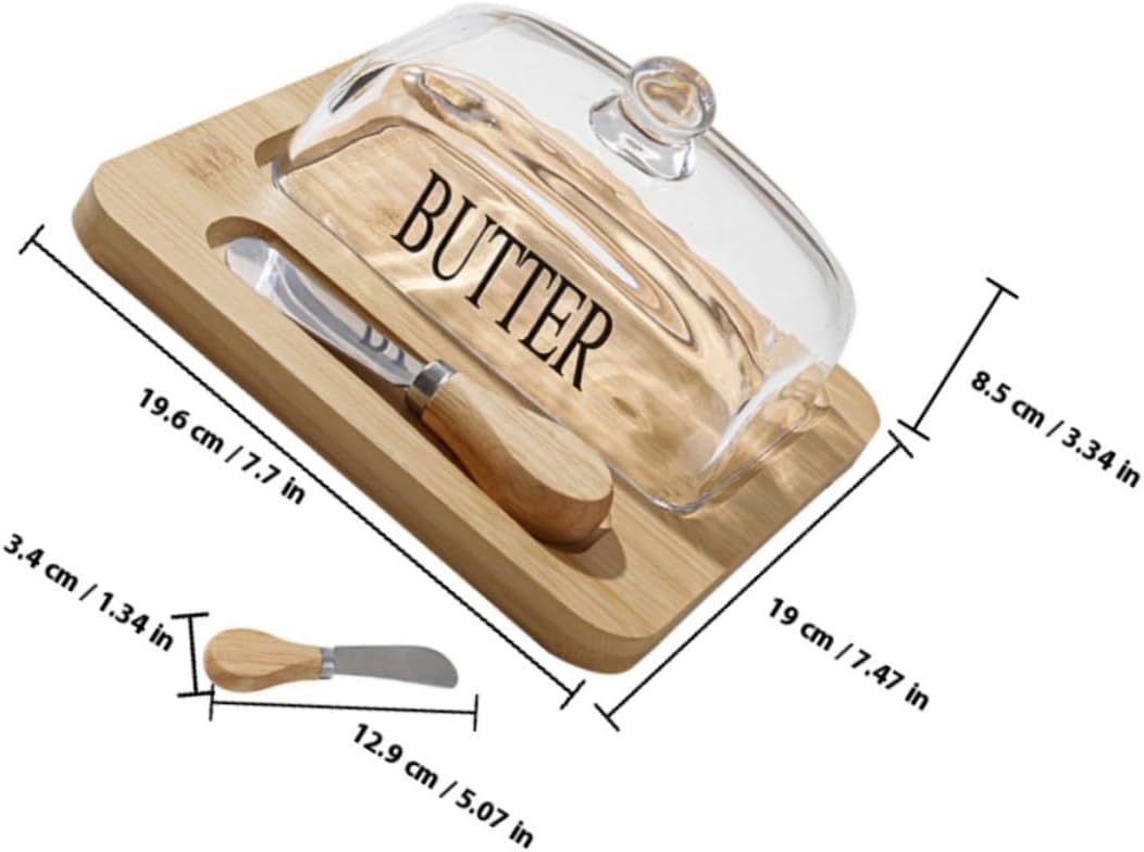 Package Include 1 x butter tray 1 x dome 1 x cutter Characteristics -Material:Wood, glass, stainless steel -Product Info:Butter box -Color:Transparent -Size:12.90X3.40X2.00cm/5.07X1.34X0.79in -Size:19.60X19.00X8.50cm/7.70X7.47X3.34in - The lid helps to keep the butter stick or margarine fresh in the freezer, without mixing the odor of other foods covered butter dish. - Simple appearance and good workmanship ensuring its popularity and practicality counter top butter keeper. - The butter container with lid is suitable for most brands of butter, brings great convenience for you. butter counter holder - Our is used for holding butter, and can also be put in the freezer for next cooking prepare covered butter dish with lid. - Save your time and keep the butter fresh, convenient for home bakery and cooking homemade butter container.Goods Descriptionbutter tray with lid Features the good material, which has high durability, not easy to deform.butter dish with dome This Butter Storage Case is made of wood material with clear glass dome and stainless steel cutter tool, which can withstand the lasting use.butter dishes Fine workmanship, it ensuring the practicality