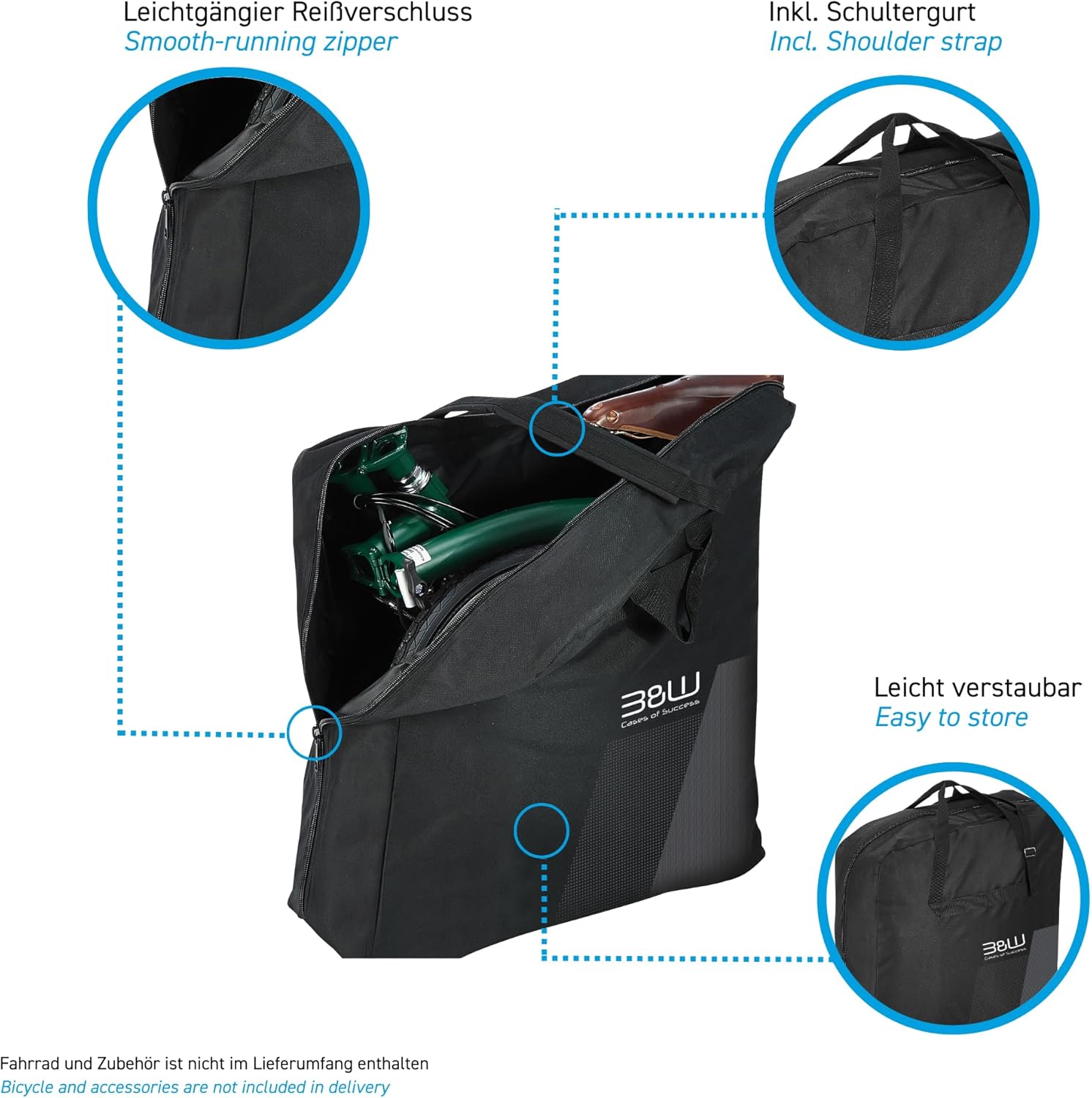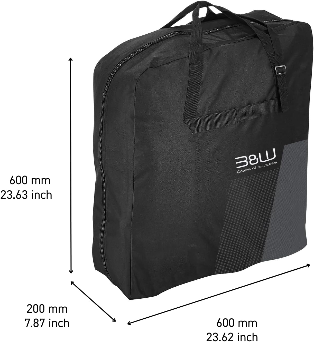 The high quality bike cases and bags from B&W are particularly suited for safe transportation of valuable bikes. B&W cases are practical and, above all, the best quality. This means you can take your own, high-end bike safely on holiday with you with ease. Combination of bike bag and bike case: bottom made of ABS merges into a bag made of padded nylon. The 96007/N Foldon Bag works for Brampton Bikes as well as other folding bikes, perfectly fitting. Bag for fold on case and fold on box made of tear-proof nylon fabric. Includes shoulder strap.