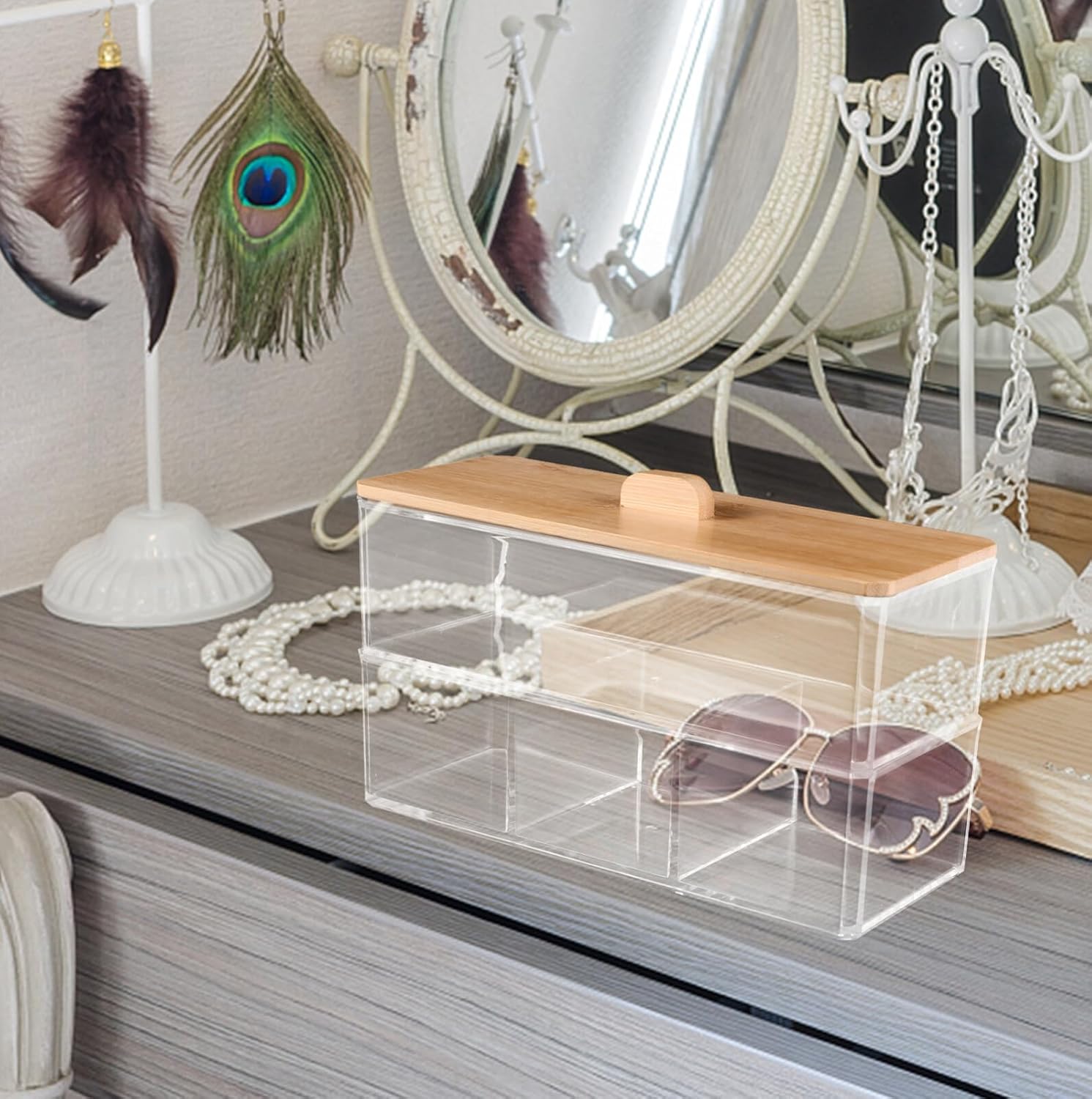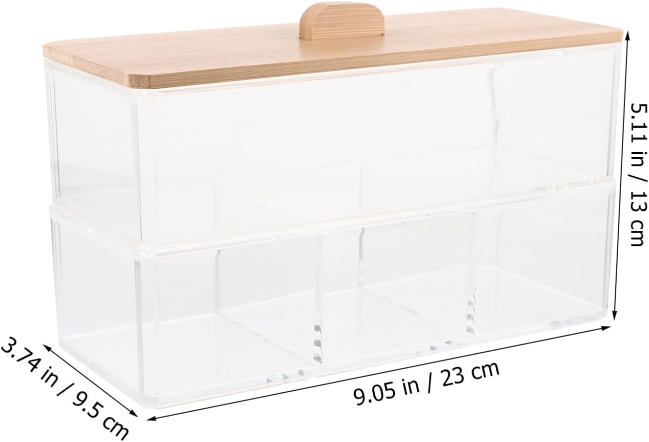 DescriptionAre you looking for a convenient and practical container for your home or you beauty salon? Our product is offered to you in time. Easy and convenient to use, put in any daily gadgets, makeup tools and hairdressing tools.Features-Color:As Shown-Material:Acrylic, bamboo-Size:23.00X13.00X9.50cm/9.04X5.11X3.73in- It provides plenty of room for storing kinds of cotton swabs, cotton balls, cotton rounds.- You could save the precious space on your dressing table, bedroom desktop or in your drawer.- Hair accessories, nail polish, cotton pad or anything else in the bathroom or vanity can be stored.- Beautiful appearance make it looks elegant sitting on your vanity, bathroom counter or dresser.- Clean design, make your own things look more neat and clean, you deserve to have one.- Color: As Shown.- Size: 23X13X9.5CM.Package Including1 x Cotton Swab Box