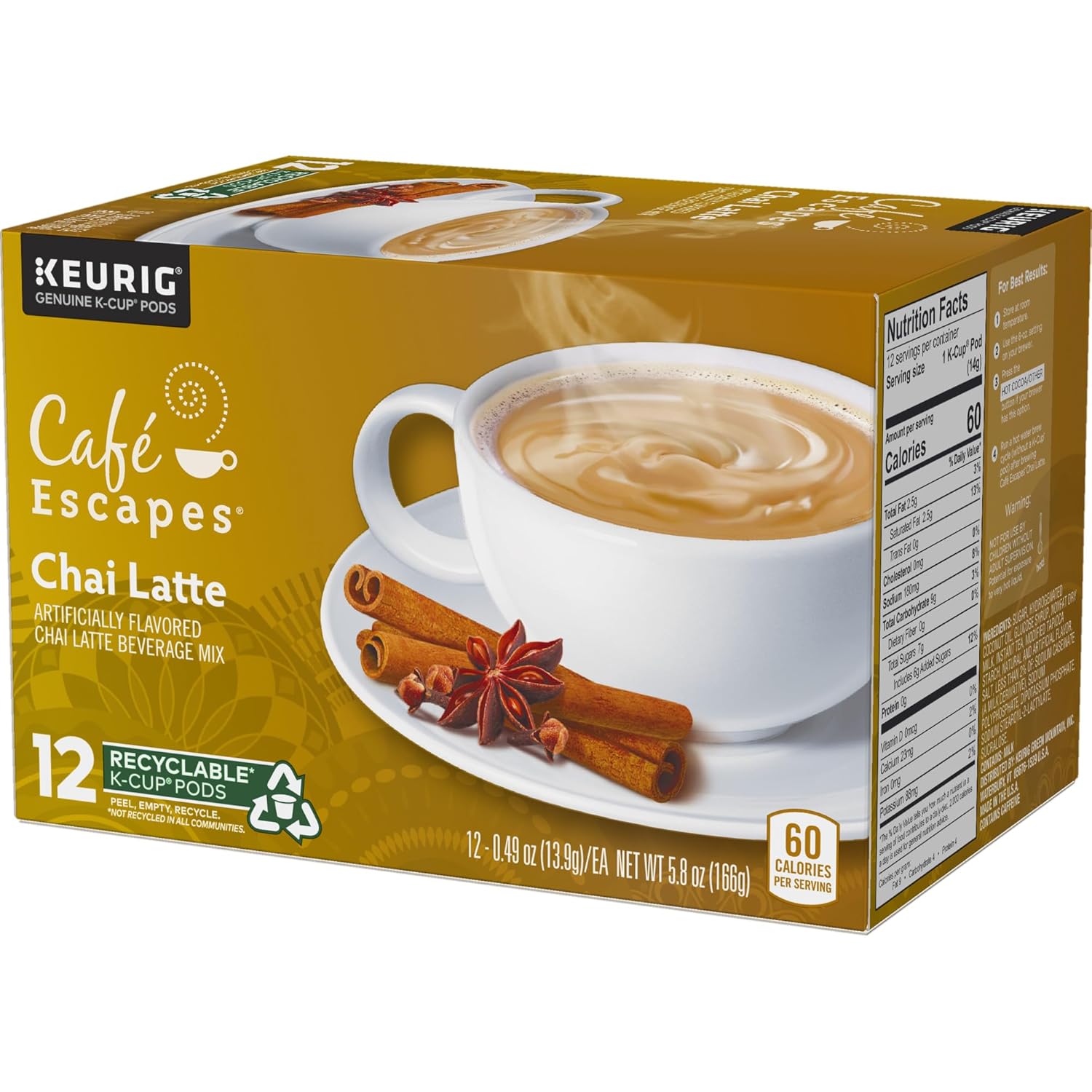 Take yourself beyond coffee. Reward yourself with a rich, indulgent café beverage that takes you beyond coffee. Each delicious variety is under 8 calories, so give in and savor a few moments. From the first taste of Café Escapes Chai Latte, you'll know this is no ordinary tea. Cinnamon and spices mingle with a splash of milky sweetness, turning your daily time-out into a relaxing escape to a far away place of indulgence. This product contains milk. Product is trans fat and gluten free. Caffeine content is estimated at less than 1 mg per serving (versus 1-15 mg in Arabica coffee). Contains a combination of natural and artificial sweeteners. Compatible with Keurig K-Cup pod single-serve coffee makers.