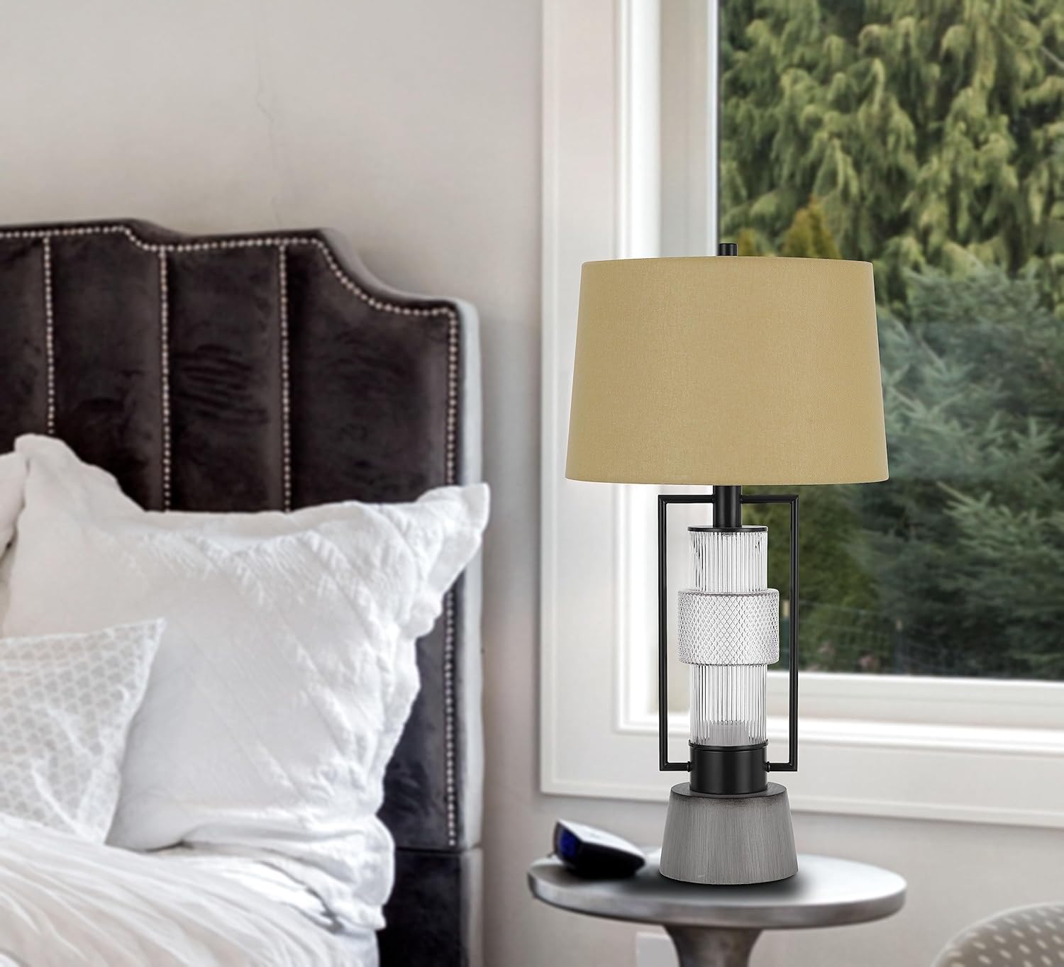 Style your home with this contemporary take on a classic lantern style lamp. It features a clear glass fluted font which has a functional led night light. This lamp is ships complete with a hardback fabric shade and matching finial.