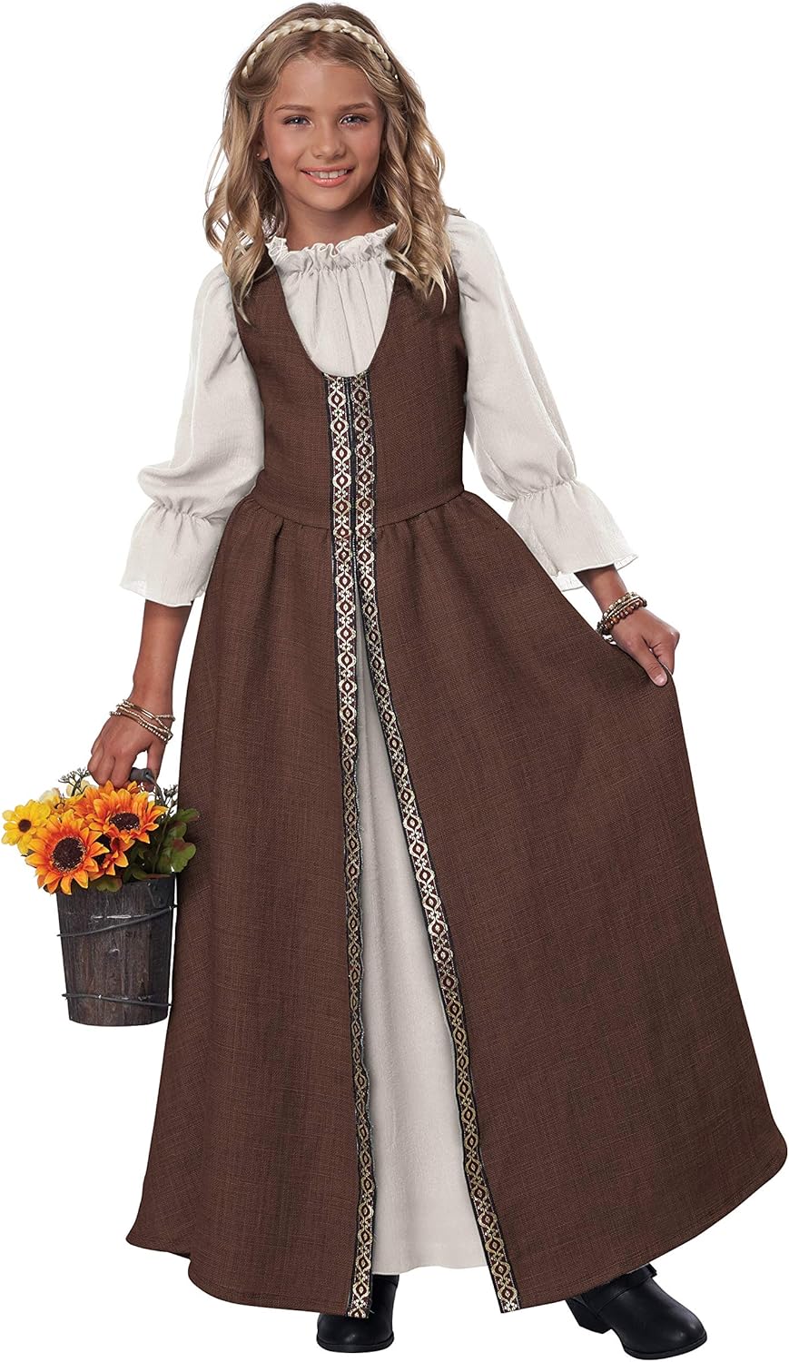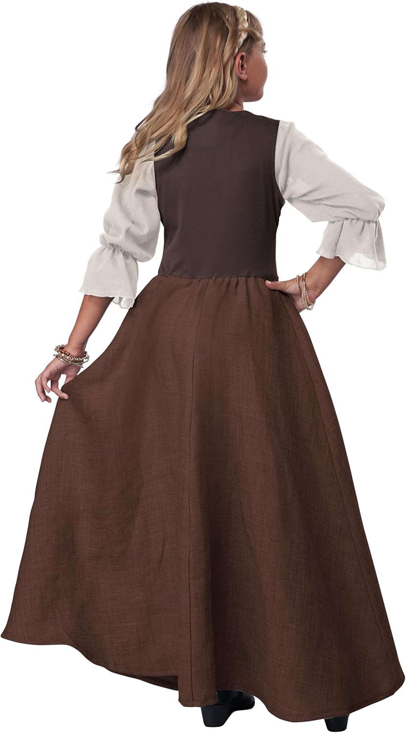 Dressed up in the spirit of Ren faire fun. The Brown Renaissance Faire Dress features a cream colored dress with ruffled collar and a brown overdress decorated with ribbon trim. The overdress back vest top panel is a different material than the front.