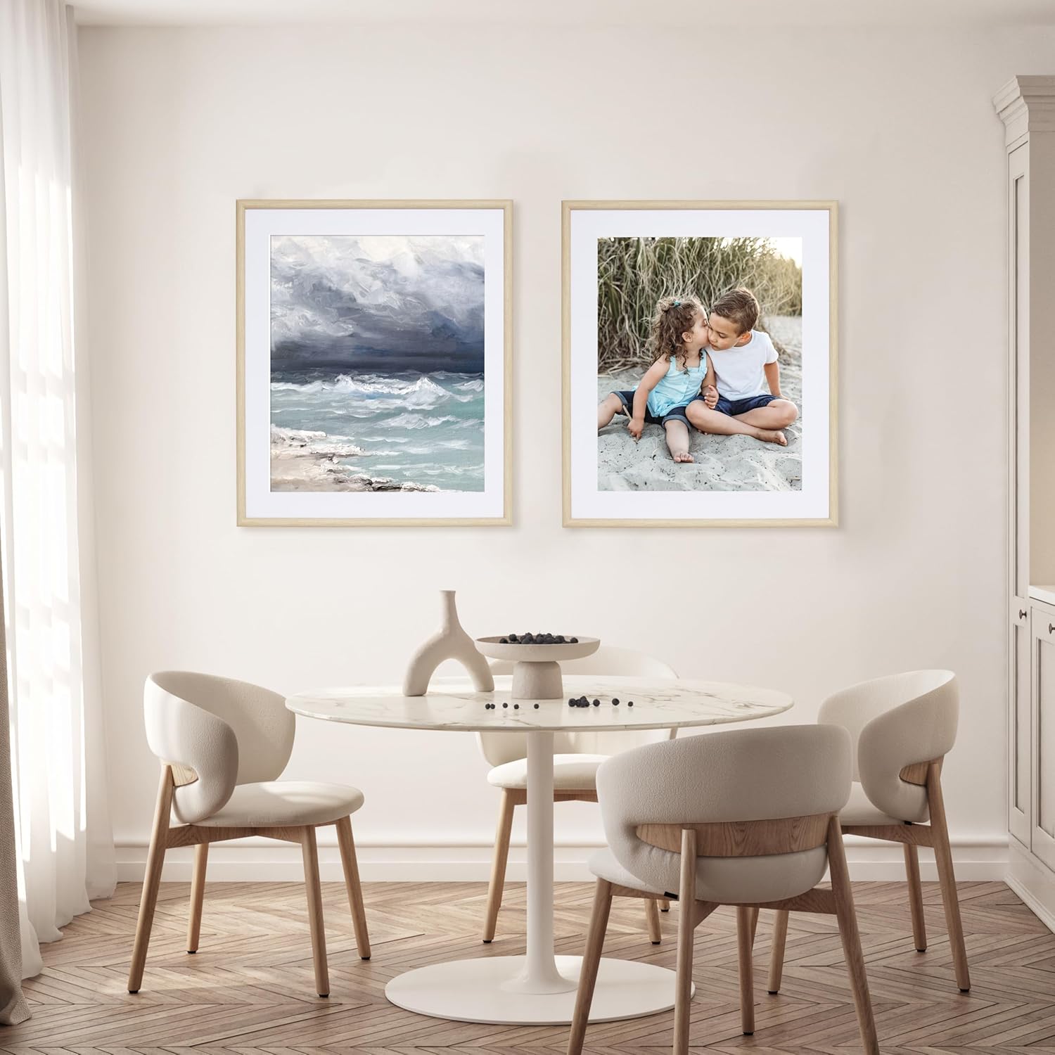 The Camden Reed Set of Two Serenity Poster Frames are the great solution to showcase your oversized portraits or art prints with an organic modern style. This stunning set combines the natural tone of a dark oak finish with sleek modern white mat. The combination of these two elements creates a visually captivating contrast that instantly draws attention to your artwork. Each frame comes with pre-attached hangers for easy hanging. Create a stunning focal point in your living room, bedroom, or any other space with the Camden Reed Serenity Poster Frames.
